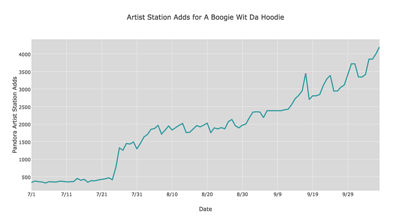 Guest post by Liv Buli of Next Big SoundHis kind and gentle demeanor stands in stark contrast to the rough Bronx neighborhood he grew up in, but A Boogie Wit Da Hoodie is no pushover.“Nah, never got my ass kicked” he says. Well maybe by a lady or two. A lot of his most popular music is inspired by a young lady he fell in love with. “My first mixtape especially, that came from a heartbreak.” He found himself in a relationship with a woman pregnant with someone else’s child. “She was playing little mind games with me. I thought it was mine.”That pain is what led to songs like Still Think About You, D.T.B. (short for don’t trust bitches), and Artist.But he is definitely kicking ass in the music industry. In just a short while, tracks from “Artist: The Mixtape” have launched A Boogie’s career, and this week he climbed to the very top of the Pandora Trendsetter chart, which ranks up-and-coming artists with the highest number of station adds each week.And while his singles are performing well (his top five tracks on Pandora all have a thumbs-up ratio of more than 73%), A Boogie is no “one hit wonder”: the number of stations seeded with the artist far outpaces track stations, at a rate of almost 70x.
