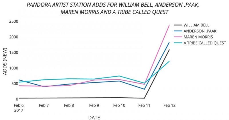Guest post by Emily Blake of Pandora's Next Big SoundWe already know who won at the 59th Annual Grammy Awards. Whether she wanted to or not, Adele won most of the major categories of the night, including Album of the Year, Song of the Year and Record of the Year for her third studio album, 25. Chance the Rapper won not only Best New Artist, but beat out his mentor of sorts, Kanye West, and Drake for Best Rap Album. And David Bowie posthumously won every award he was nominated for.But who won in streaming? Who saw the biggest lift from Sunday night’s telecast? As it turns out, it wasn’t the Adele or Beyoncé who reaped the biggest rewards.It was a huge night for Memphis soul singer William Bell, who not only won the award for Best Americana Album, but had a standout performance with Gary Clark Jr., performing Bell’s “Born Under a Bad Sign.” On Sunday, Bell saw close to 1,600 artist station adds on Pandora. While those definitely aren’t Beyoncé or Adele numbers, but it is a significant uptick from the number’s he’s used to seeing — a 12,085% week-on-week lift, to be exact. Gary Clark Jr., who also starred in a Lincoln commercial that aired twice during Sunday’s telecast, saw a over 6,600 artist station adds on Sunday after a 3,239% week-on-week jump.