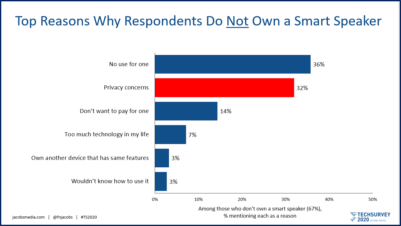 We were curious about why fewer consumers were willing to bring a smart speaker into their homes and places of work. So in our pre-pandemic Techsurvey 2020 (fielded in January and February – right before COVID), we asked those who had not purchased one of these devices to tell us the reason: