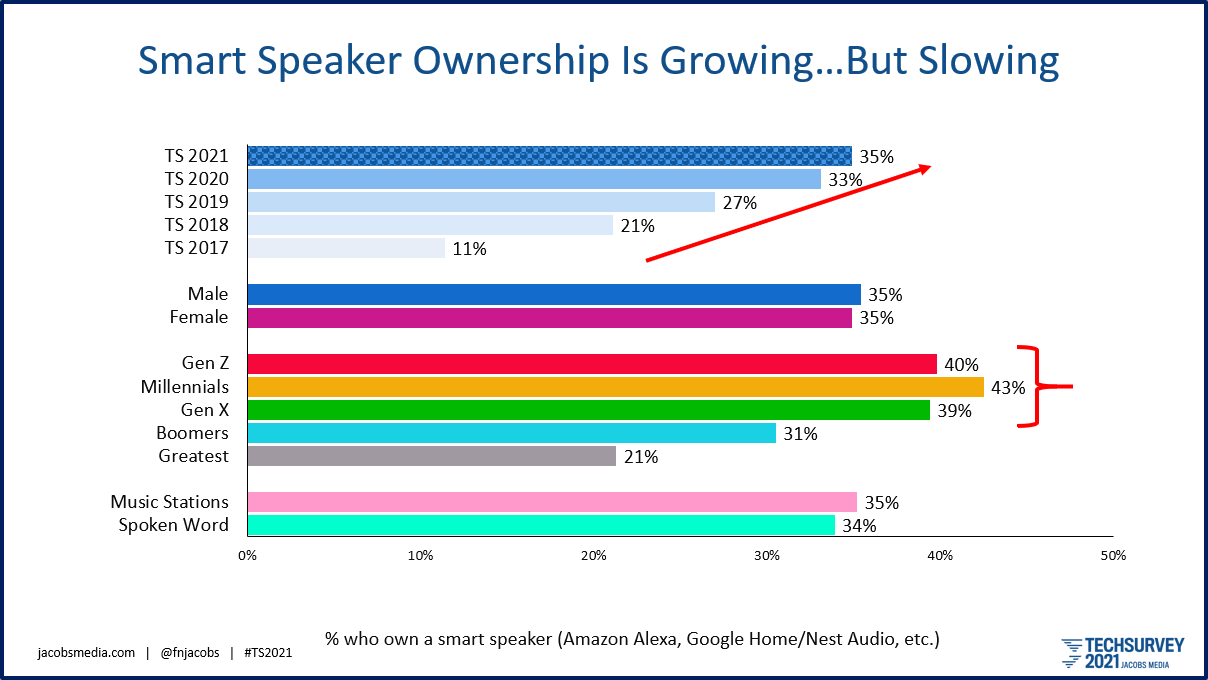 Looking at our most recent Techsurvey 2021, fielded last January and February, you can see why. Among our core radio listeners – pretty darn predictable of the overall population, by the way – smart speaker growth doubled in 2017-18. The increase continued more modestly the next year, and then the year after that.