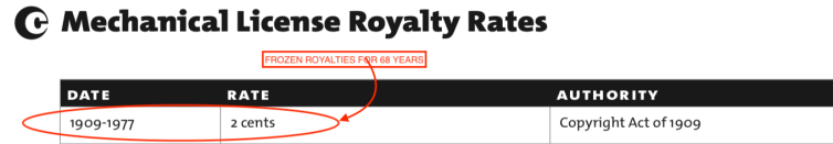 If you don’t know the history, you may think that songwriters are paid so little because somehow they don’t deserve more. That’s not true. The reason that songwriters are paid so little is that every U.S. mechanical royalty rate we have and have had since 1909 somehow refers back to the 2¢ rate set by Congress in 1909 that did not change until 1978. (And due to America’s long commercial shadow, that base-2¢ valuation is visited on the rest of the world.)