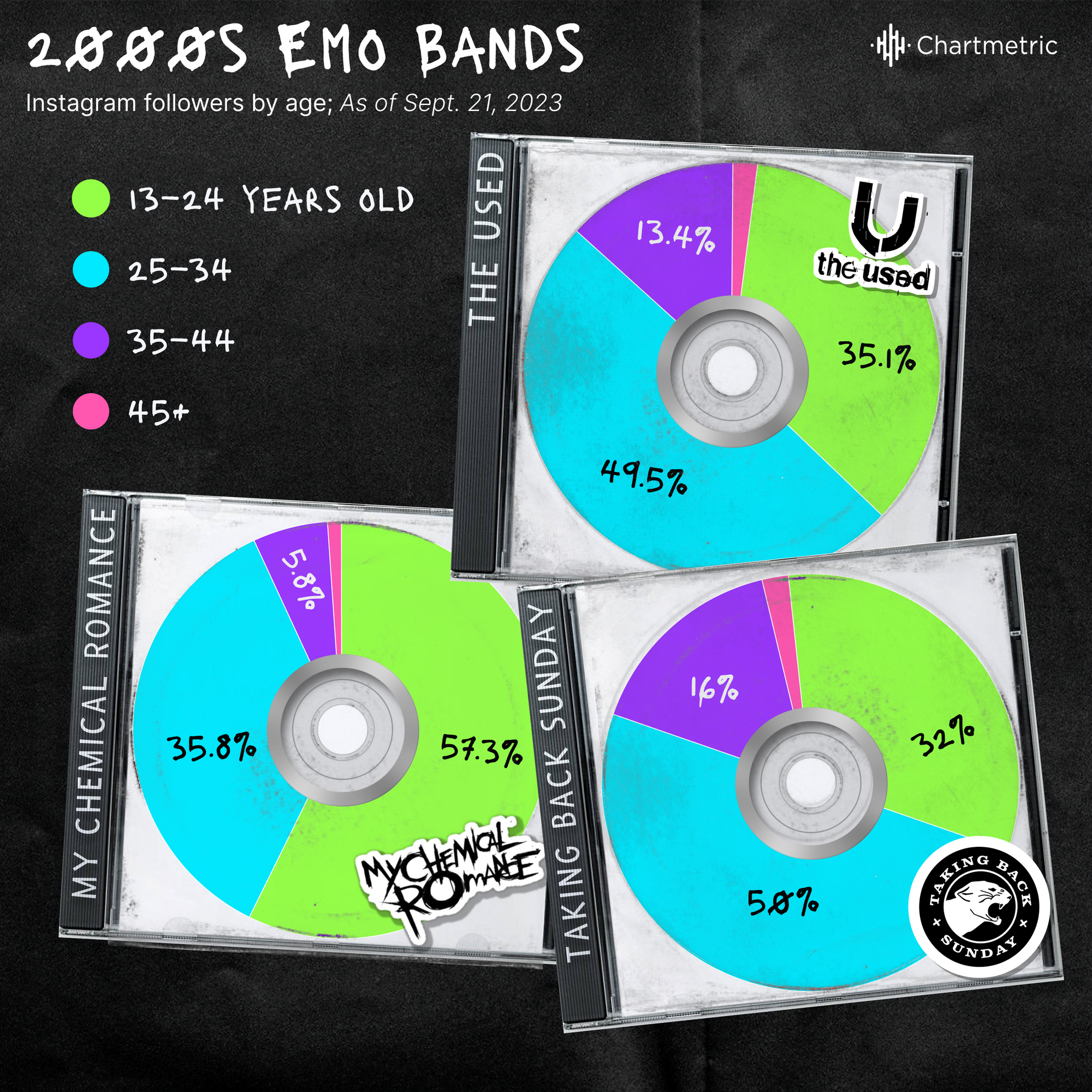 But beyond where audiences are, age is perhaps the biggest indicator of an upcoming emo revival. For example, Taking Back Sunday’s YouTube demographics are dominated by Gen Z listeners who were infants when “Cute Without the ‘E’” and “You’re So Last Summer” came out. The Used also has incredibly strong Gen Z followings across YouTube, Instagram, and TikTok. MCR’s core listenership is also female Gen Z listeners between 18–24 and millennials between 25–34.