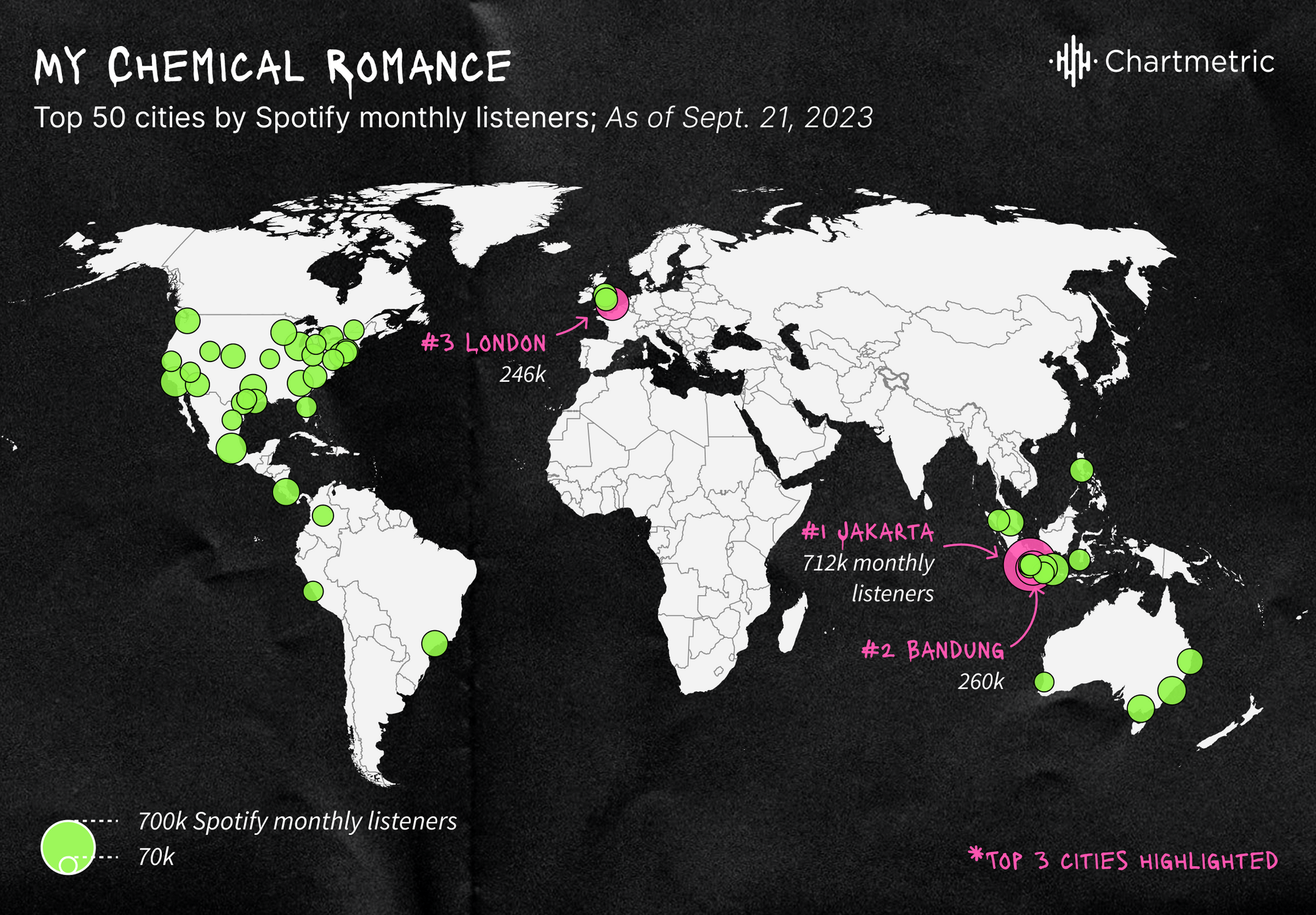 In Jakarta, Indonesia specifically, there has been a significant spike in listenership since mid-May 2023 that had MCR rambling towards one million listeners out of the city alone, four times that of Motley Crue’s or Def Leppard’s spikes over the past six months. When compared to the two legacy hair metal examples, MCR blows each out of the water.