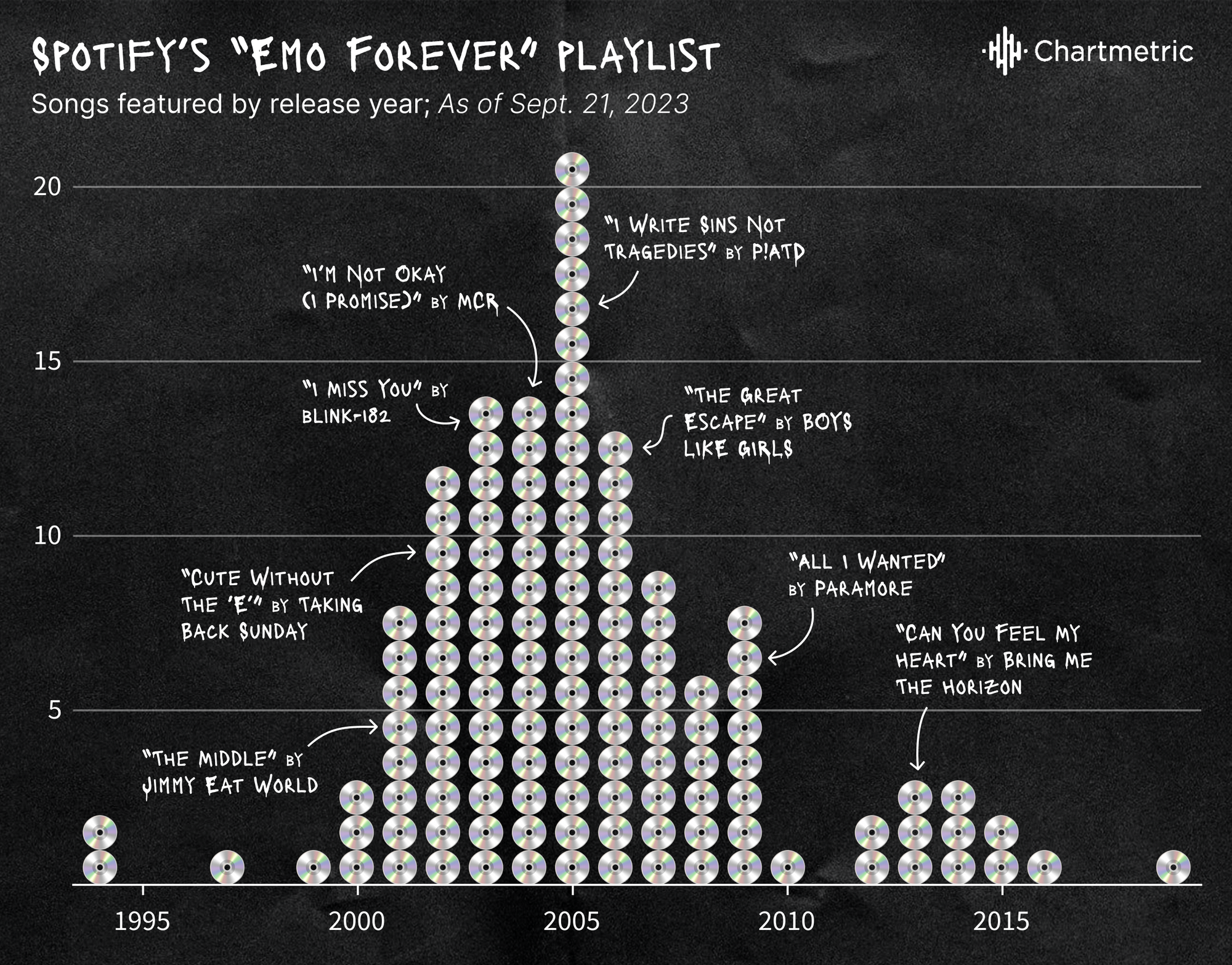Even for its popularity, many fans who were a part of the scene 15 to 20 years ago reflect on the time with a certain amount of cringe. Perhaps these mixed emotions are best exemplified by Spotify playlists with titles like kind of embarrassed, kind of jamming the fuck out and IT’S NOT A PHASE, MOM. But beneath the surface, there was a richness that cannot be so easily written off as teenage angst. The genre was holding a mirror up, more or less, on a larger, growing population of sensitive young people. In December 2021 Spencer Kornhaber wrote for The Atlantic: “Emo is not only a music of sadness—it is the music of change, uncertainty, and desperate, joyful connection.”
