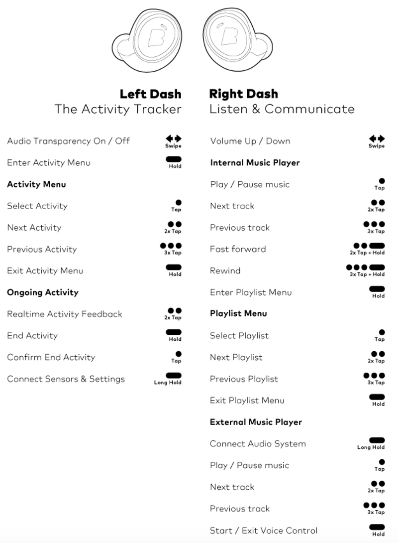 After using a bunch of these new wireless earbuds myself, I got frustrated that we were so close — the devices were here — but they were really hard to use.Once you get really small earbuds, controls, pairing, and management become really hard. Just look at this list of touch gestures from The Dash. It makes sense that you’d want to have all these controls and yet, the experience is worse because it’s hard to remember how to do the different tasks, and if you mess up, the no-look interface becomes hard to “go-back,” so-to-speak.