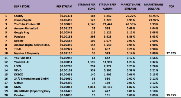 Guest post by David Lowery of The TrichordistHere we go again. To see previous years, click [here].This data set is isolated to the calendar year 2018 and represents a mid-sized indie label with an approximately 250+ album catalog now generating almost 1b streams annually. 2018 is the year we saw streaming truly mature as the dominant source of recorded music revenues.In parsing the data provided we find that digital revenues are 86% of all recorded music revenues globally (RIAA Reports Digital Revenues as 90% of Total). Streaming is 80% (or more) of Digital Music Revenues. Downloads are about 20% of digital music revenues for the year, however if we isolate Q4, it would appear download revenues could be less than 15% of digital revenues. The transition from downloads to streaming is well beyond the tipping point and we wonder how long the major services (Apple, Amazon, Google) will continue to support the format.As we dig down into the physical revenues much of the gross is eroded by manufacturing, shipping and inventory costs of both CDs and Vinyl. In short, the recorded music business is now the streaming music business. Whatever charm there is to vinyl, it is at best still a truly niche business in terms of meaningful net revenues.Every year there are surprises in the data and this year is no exception. As always we present this data as a single sample, but one we feel is fairly representative of the state of the business. As such, we welcome comments from others with access to similar data to report on their findings. Some of the percentages may vary dependent upon the genre of music and the size of the label or artist. However, we generally don’t find trends that are completely contradictory to our sample where it matters most, in reporting on stream rates and relative marketshare.We’ve also simplified the chart this year. Just one chart, and only the Top 20 streamers which represent 99.35% of all streaming dollars. The Top 10 streamers account for over 97% of all music streaming revenues. The Top 5 account for over 88% of all streaming dollars. What we see below is a maturing marketplace with a small number of dominant players. Anyone who thought the digital revolution would remove so called “gate keepers” are painfully wrong.If you want to compare these numbers against the RIAA’s official report for the first half of 2018, click [here]. That data is for the USA and only through June of 2018. It’s hard to get “apples to apples” reporting, so everything should be taken as different perspectives on the overall business. If you are an artist or label, see how your own data compares.The biggest takeaway by far is that YouTube’s Content ID, (in our first truly comprehensive data set) shows a whopping 48% of all streams generate only 7% of revenue. Read that again. This is your value gap. Nearly 50% of all recorded music streams only generate 7% of revenue.