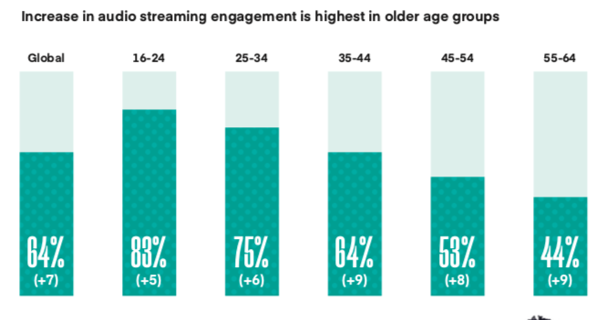 3. Adults are increasingly embracing audio streaming services. 64% of all respondents have accessed a music streaming service in the past month – up by 7% over last year. The highest rate of growth for engagement is in the 35-64-year-old age group, with 54% of that group accessing a music streaming service in the past month, up 8% since 2018.