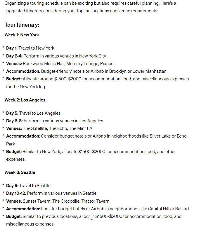 Here’s a prompt we used to illustrate this example: “Help me organise a touring schedule to support my latest music project. My top fans are located in New York, Los Angeles and Seattle. The venues in the itinerary need to be 50-100 cap venues. The band consists of four people, and we’ll be driving ourselves. Include budget and accommodation options.”