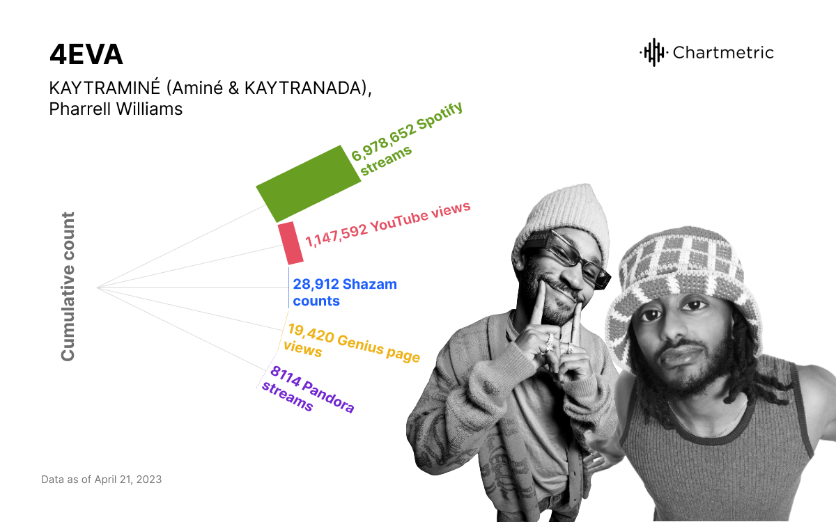 “4EVA,” a fusion of funk, dance and club music with producer Kaytranada and rapper Aminé, is almost a decade in the making. In 2014, the Portland rapper created an unofficial remix to the producer’s “Not At All” in 2014, which sparked a collaborative relationship between the two (Kaytranada produced three tracks on Aminé’s debut mixtape Calling Brio, including “La Danse” which has 2.1M streams on SoundCloud). Since then, the two have risen to higher echelons on their own, and are poised for even greater heights as KAYTRAMINÉ, a portmanteau that blends both of their names and sounds. One day after its release, “4EVA,” featuring Pharrell Williams, who co-produced the track, garnered over 1M streams on Spotify, earning its spot on prized editorial playlists like Rap Caviar and POLLEN.