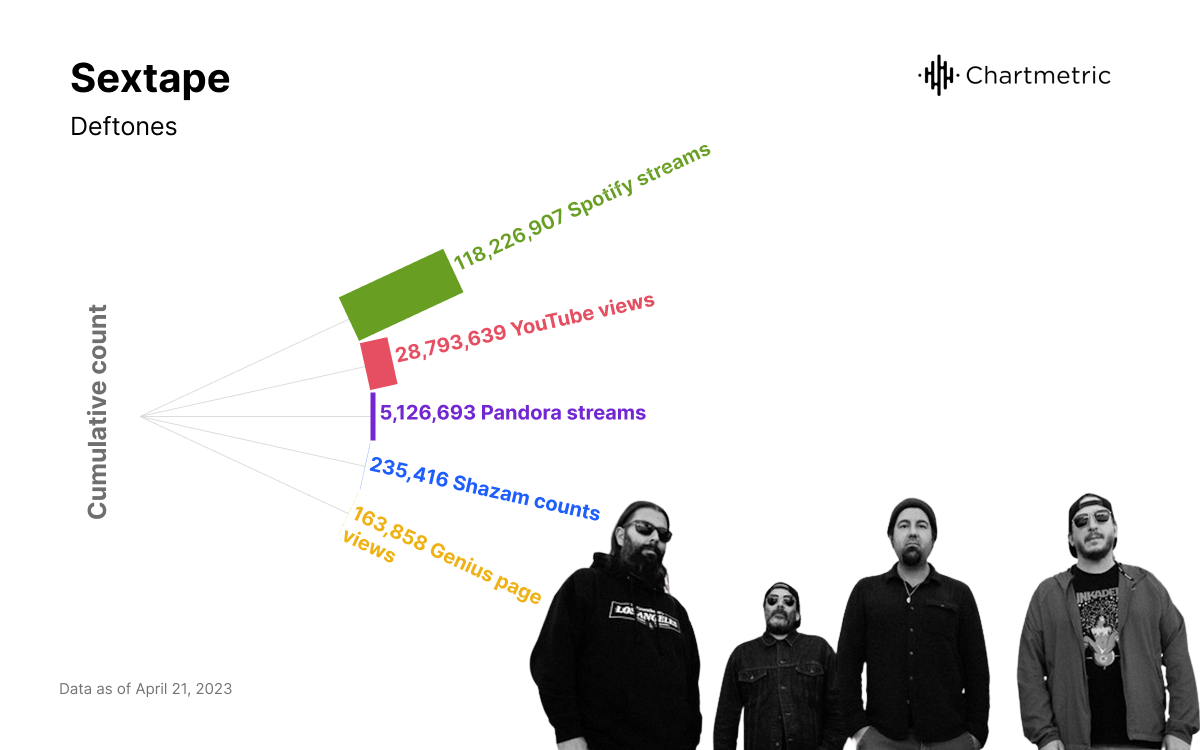 California nu-metal progenitors Deftones keep landing TikTok hits without even trying. Since 2020, the band’s 2000 track “Change (In the House of Flies),” has garnered 76.9K videos, while 1997’s “Be Quiet and Drive Far Away,” has reached 33.1K videos, with three other tracks breaking the 15K video mark. Their 2010 song “Sextape,” is the latest minor hit on the app, peaking at No. 63 on the Canadian TikTok charts and No. 167 on the US TikTok charts this April. The renewed interest in the band has led to considerable growth in their Spotify monthly listenership, which has climbed from 6.3M to 8.1M listeners since the start of 2023—pretty impressive considering they haven’t released new music in two years.
