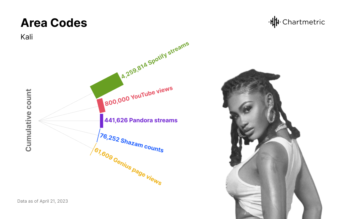 “Area Codes,” the infectious new single from rising Atlanta rapper Kali, modernizes the famous Ludacris 2001 hit of the same name. Kali brings a newfound confidence to the track, with a flow that oscillates from nimble to deliberate, that is resonating with her audience. “Area Codes,” once a song used to demean women, is now being subverted by TikTok users praising the versatility of Black beauty. Since its release last month, the audio has been used in 253K videos, with hair and makeup trends transforming fans into seemingly new women. “Area Codes” has catapulted Kali’s playlist reach, giving her a 56 percent increase in editorial playlist placements, appearing on Spotify’s Get Turnt, big on the internet, and Feelin’ Myself.
