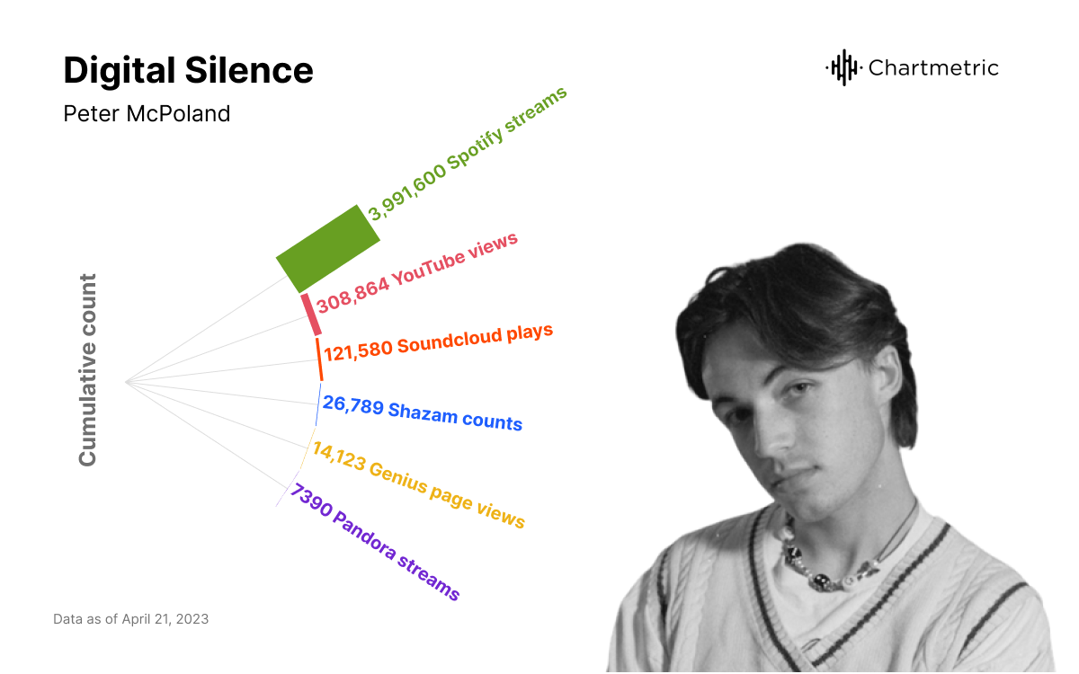 Twenty-year-old Peter McPoland returns with “Digital Silence,” an evocative track that feels like a call-to-action for a better world. On the track the folk-pop luminary asks a string of rhetorical questions: “Why don’t you get it? Can’t you get it? Understand?” Catching young listeners who feel helpless against exhausting news cycles nearly 1M TikTok users have liked the sound, with some of the most popular clips utilizing McPoland’s query to bring awareness to the ban of hormone therapy for trans children and mass shootings. Since its release on April 7, the track has been played nearly 3M times on Spotify and landed on significant playlists like The New Alt and big on the internet.