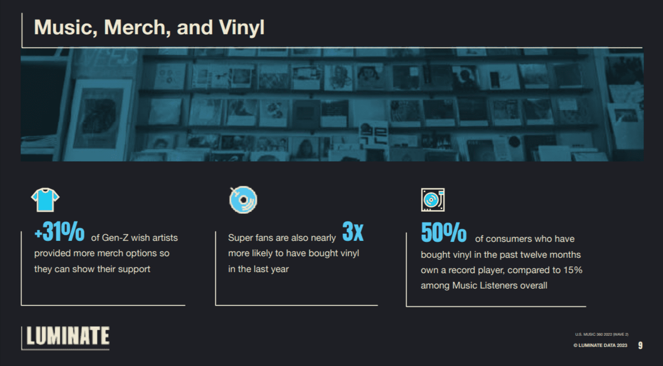 Superfans and Gen Z are driving vinyl sales, according to Luminate. 31% of Gen Z fans wish that artists provided more merch options so that they could show their support, and Superfans are 3X more likely to have bought vinyl in the last year.