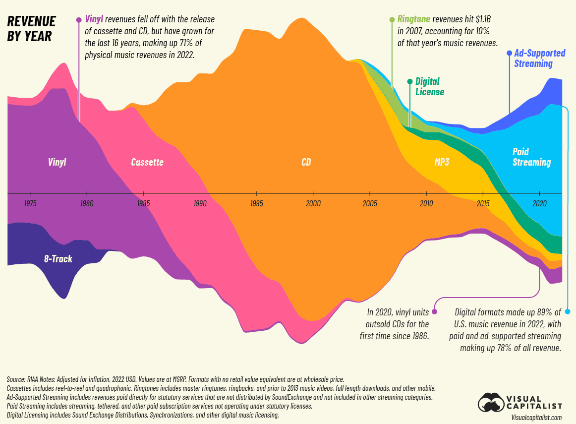 Read more: https://music3point0.com/2023/10/25/a-look-at-50-years-of-music-industry-revenues/#ixzz8HCKqRbYa