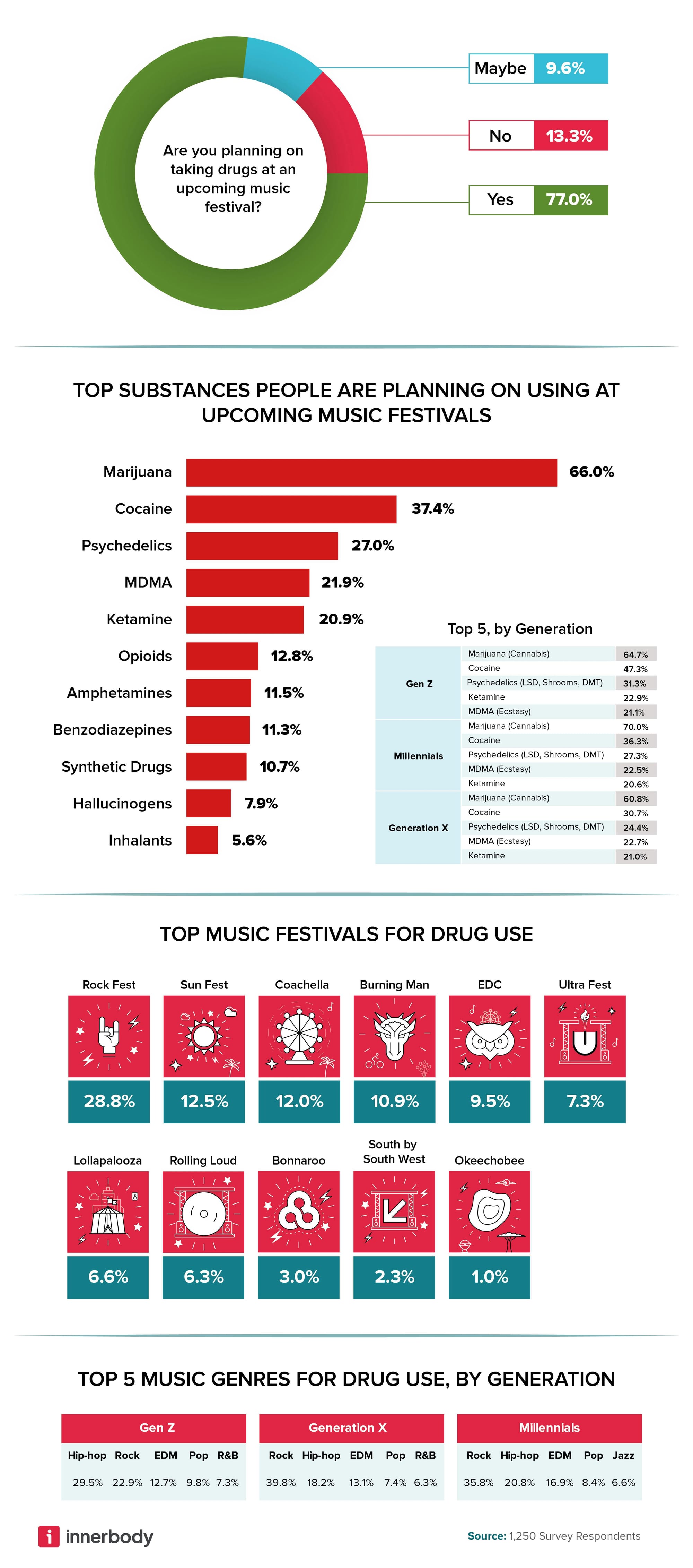According to a new survey, 77% of US festival-goers admit they plan to use drugs during their next festival. That’s a very sobering stat for festival organizers in two distinctly different ways.
