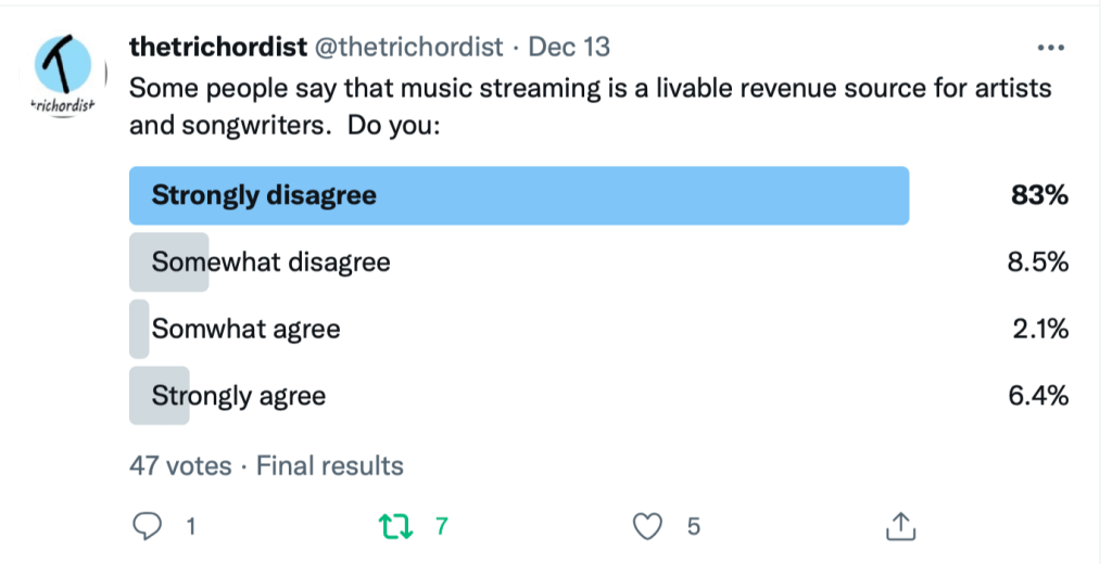 The Trichordist team did an informal poll on Twitter and to measure see what their readers thought about streaming as a livable revenue source.