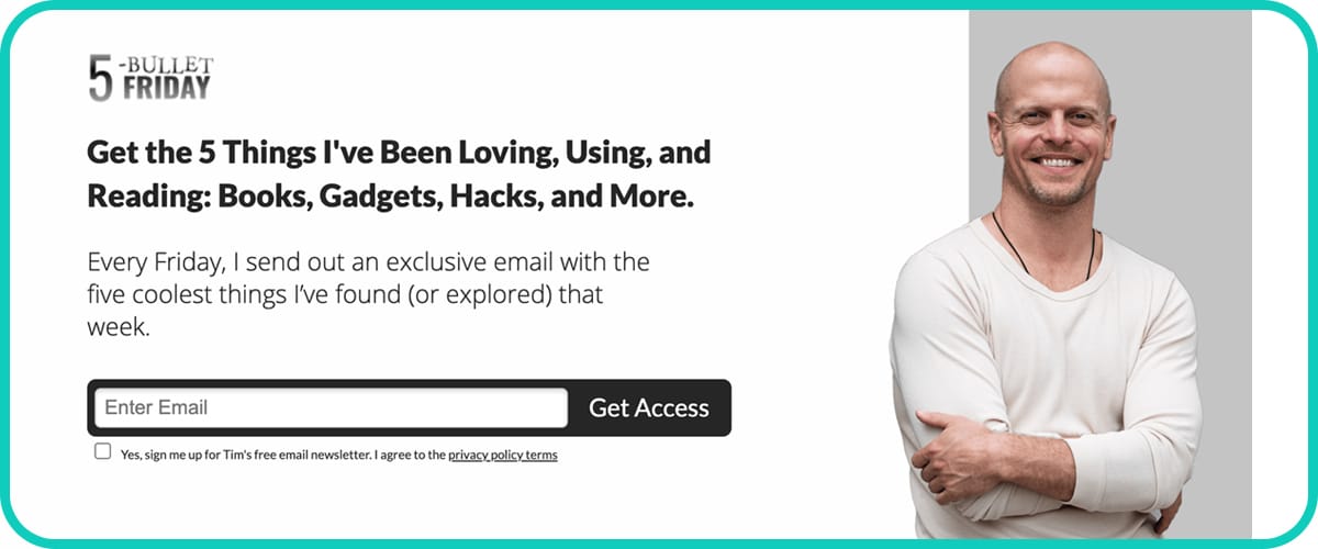 Here’s a newsletter every entrepreneur and high-level goal-setter should read. Tim Ferriss is most famous for his book The 4-Hour Workweek, a must read for anyone who doesn’t want to waste time. His 5-Bullet Friday newsletter is both a nice break from constant industry and tech talk, and a good look into things you might take in to fill the creative well.