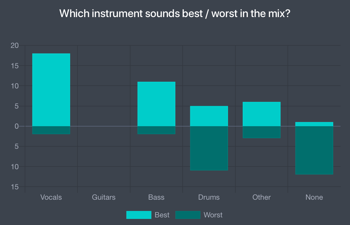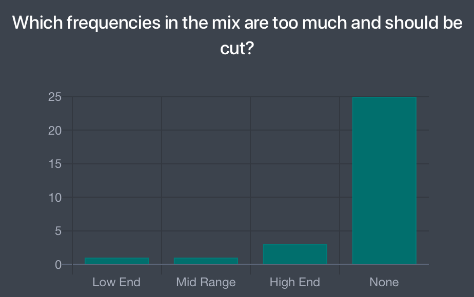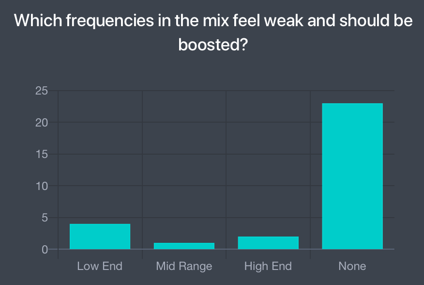 Followed by a handy chart designed to pit band members against each other:Fortunately, Drooble reviewers aren’t listening on laptop speakers!I can imagine the next two charts being extremely useful if the mix isn’t quite dialed in:Two more questions round out the page: