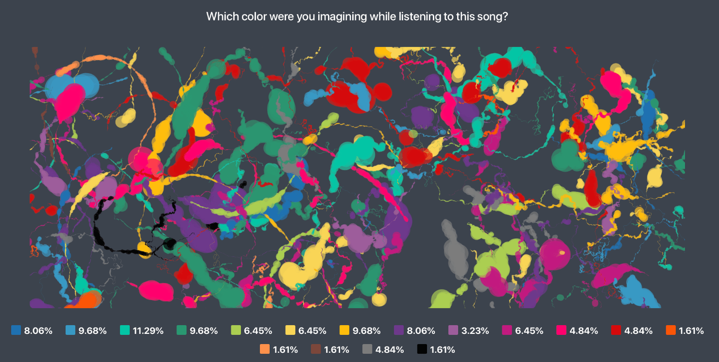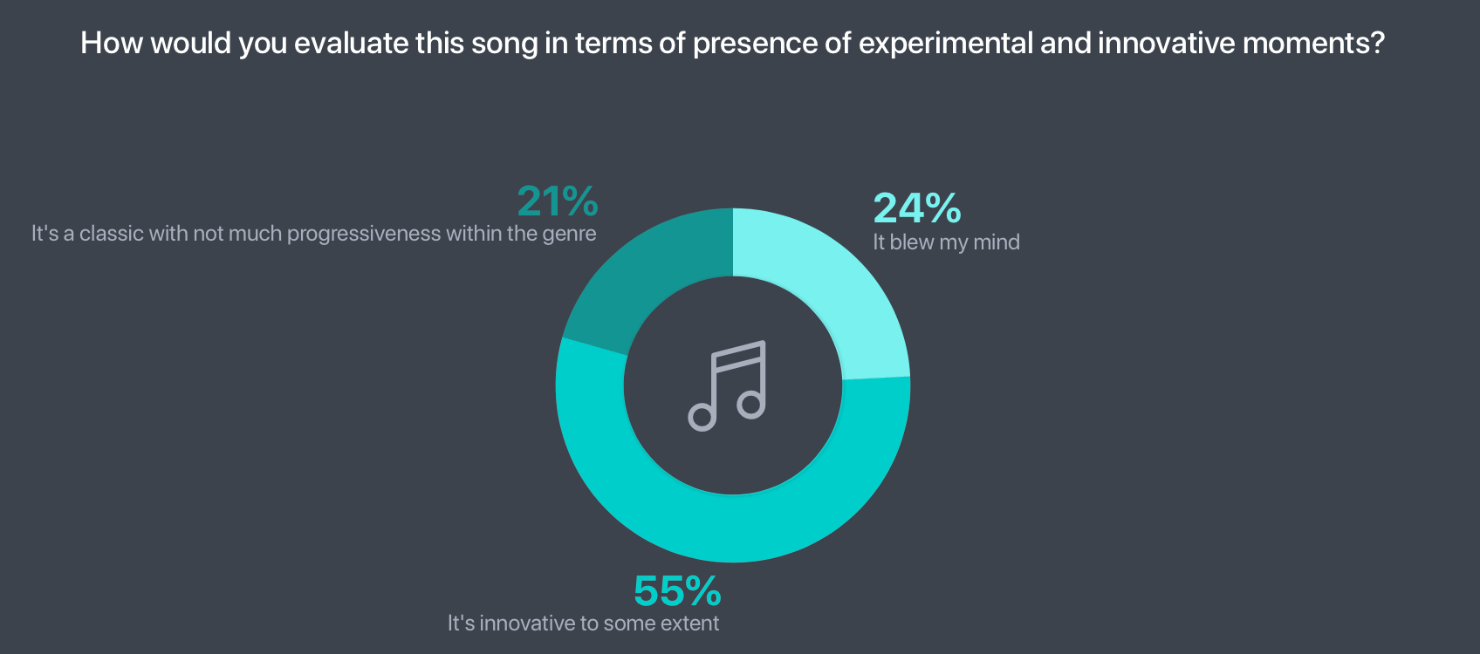 Next up is scores for seven instrumental groups. Hallelujah for N/A!The section closes with an open-ended question: “What picture do you imagine while listening to this song?”The responses are all over the place, as you might imagine.