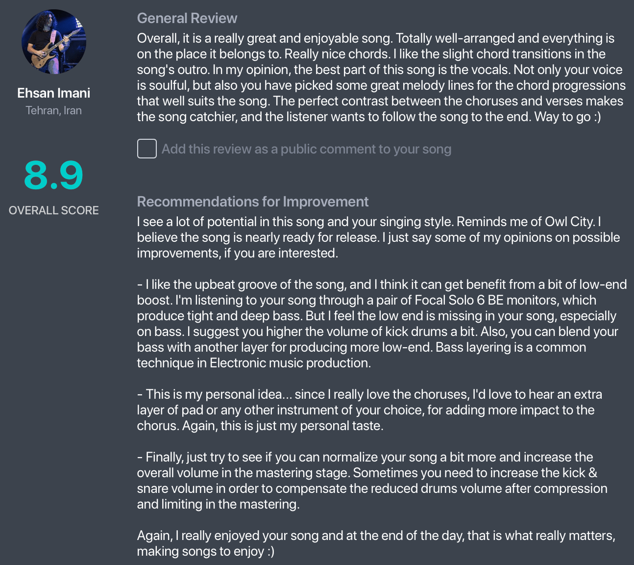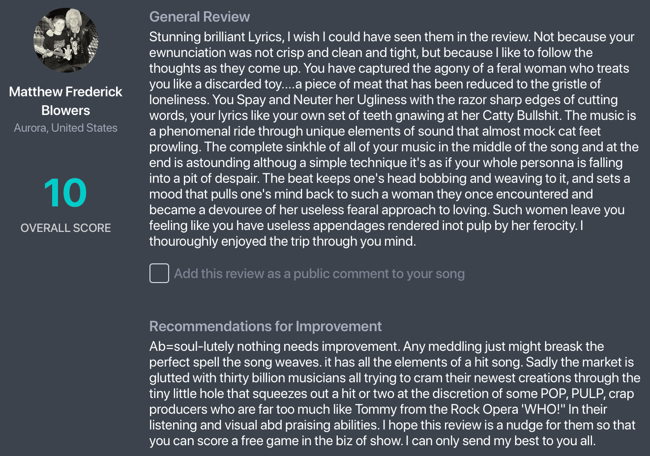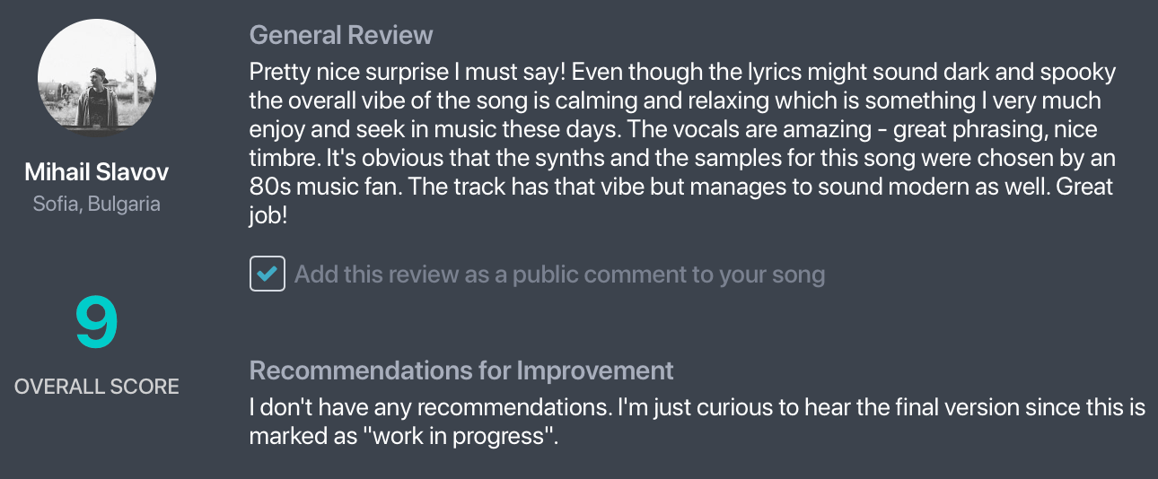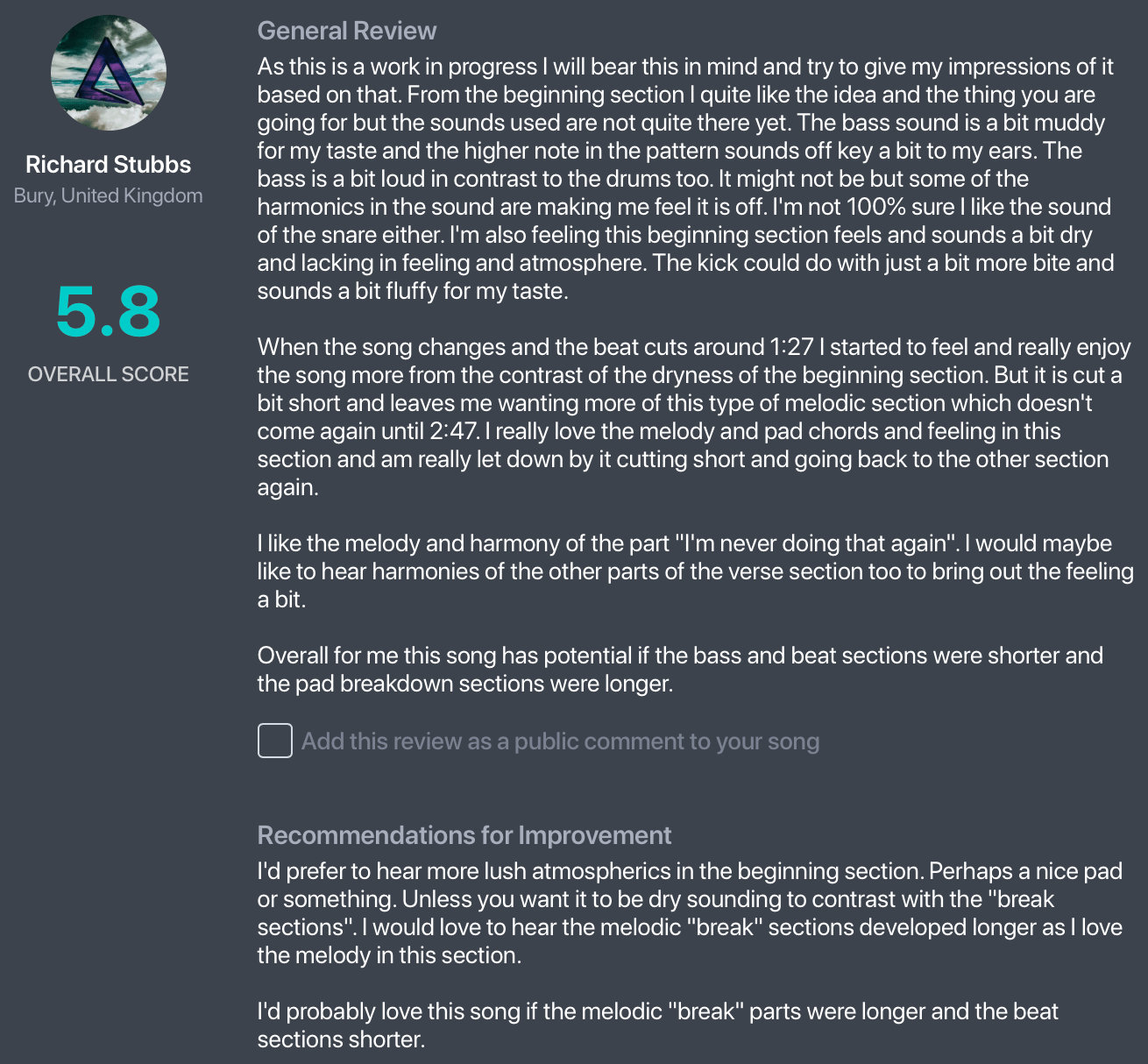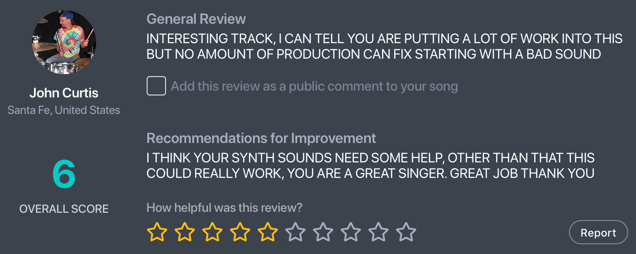 The next page contains a 1-10 score along with written notes from each of the reviewers, divided into two parts: General Review and Recommendations for Improvement.Speaking of karma, you can rate each review on a scale of 1-10 stars. You can also choose to add any of the reviews as public comments on the song.The vast majority of written feedback was useful and insightful. In fact, Drooble even published a guide to reviewing music. You can tell a lot of time and repeat listenings went into some of these reviews.Here’s a sampling: