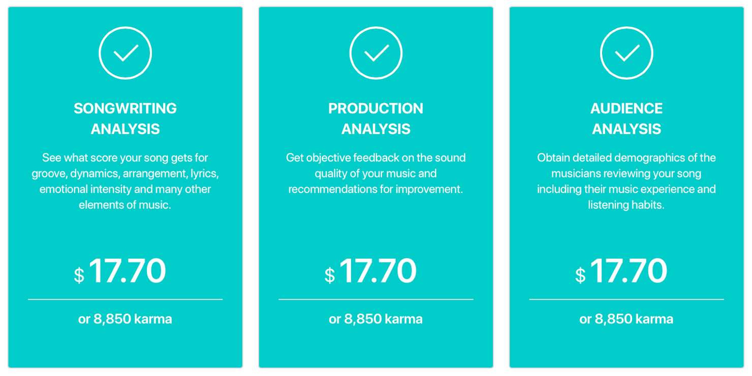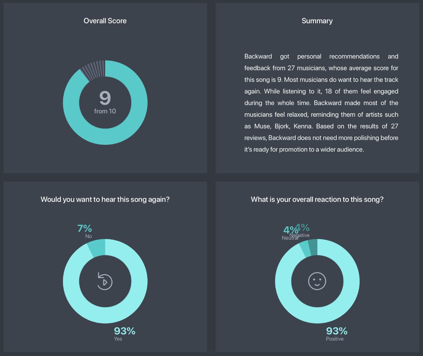 The submission process is straightforward. You confirm the song’s genre(s), indicate whether it’s a finished production or a work in progress, and note any specific feedback you’re looking for (“are the vocals too loud?”).Next, you get to select your audience!My selections are mirrored in the screenshot above. I kept it pretty broad, knowing that the platform was new and the pool of reviewers likely small.Make sure the first genre you enter, both when you upload your song and when you select your audience, is one of their primary genres. That’ll ensure better matching and make the song eligible for chart placement.Pricing is slightly higher than ReverbNation Crowd Review, but with a smaller minimum order: $6.90 for 10 reviews on Drooble, versus $12.25 for 25 reviews on Crowd Review. You can also pay in karma.There are also advanced insights available at an extra cost:I was given a promo code to test out the service, which I did with five songs. I went with 30 reviews each plus all the bells and whistles. At today’s pricing, that amounts to $73.80 per song.That’s a lot of money, but as you’ll see, you don’t always need the extras. Most of the value is in the written feedback, which is included in the base price.You can get a 30% discount on your first Song Review on Drooble and support the site by using promo code COLORTHEORY here.I’m going to talk you through a report section by section, but it’s much prettier in its native environment. Take a look!Here’s the song in question, which I describe as “an 80s ballad from A Nightmare on Elm Street,” embedded straight from Drooble.