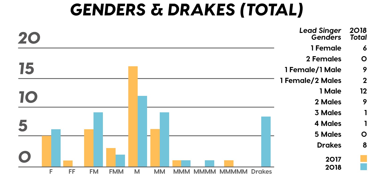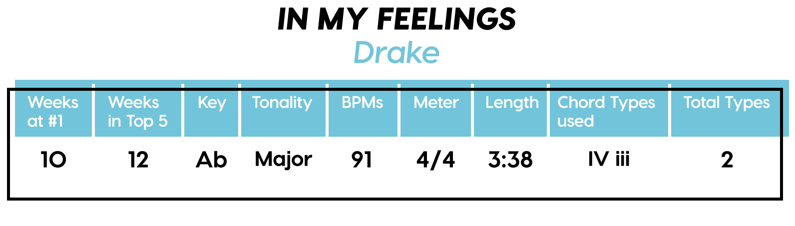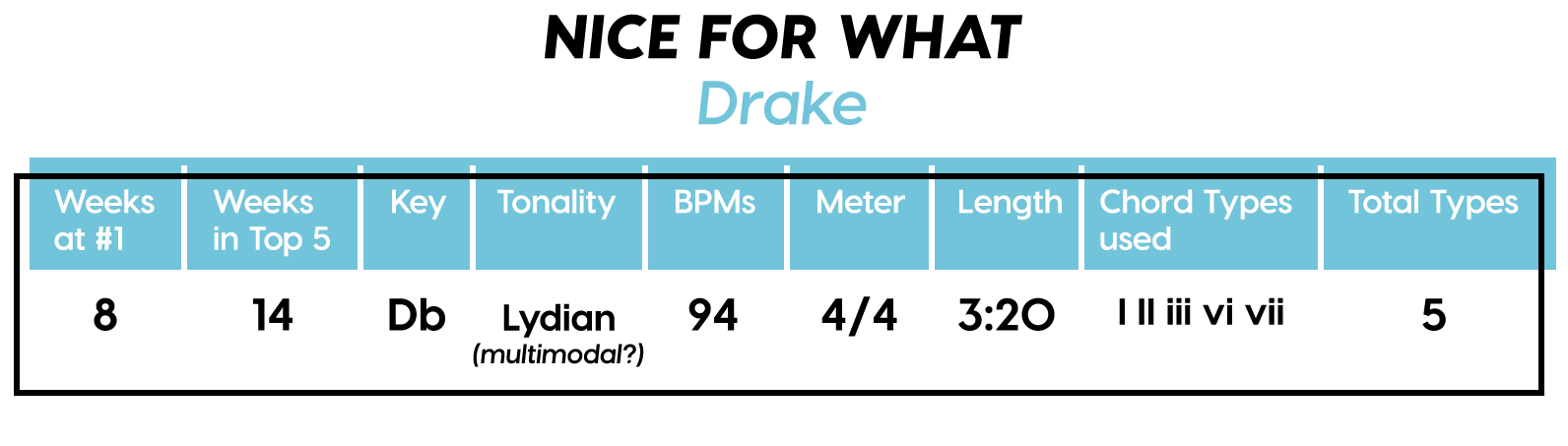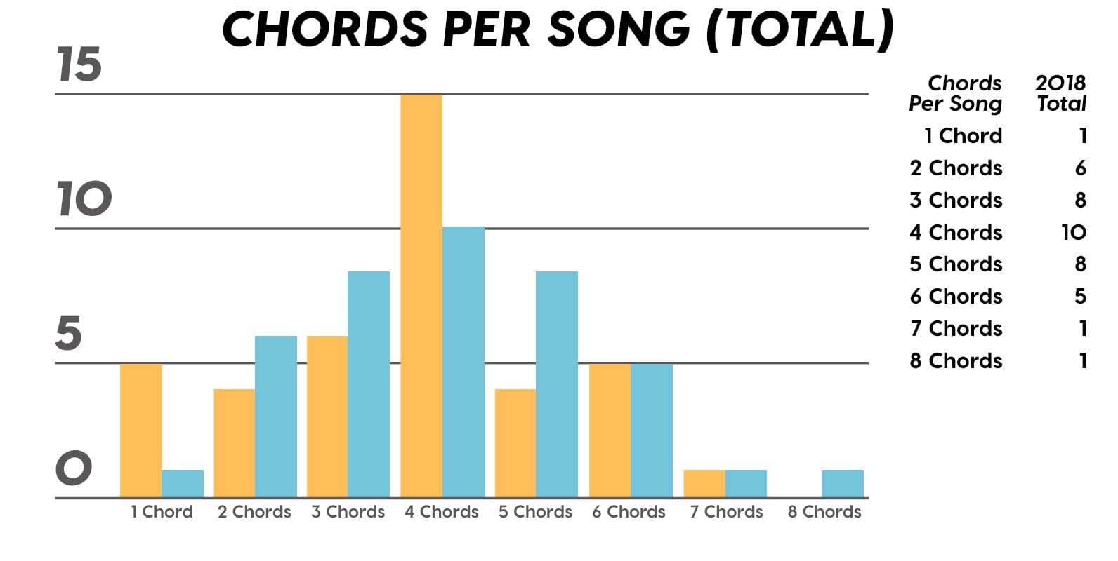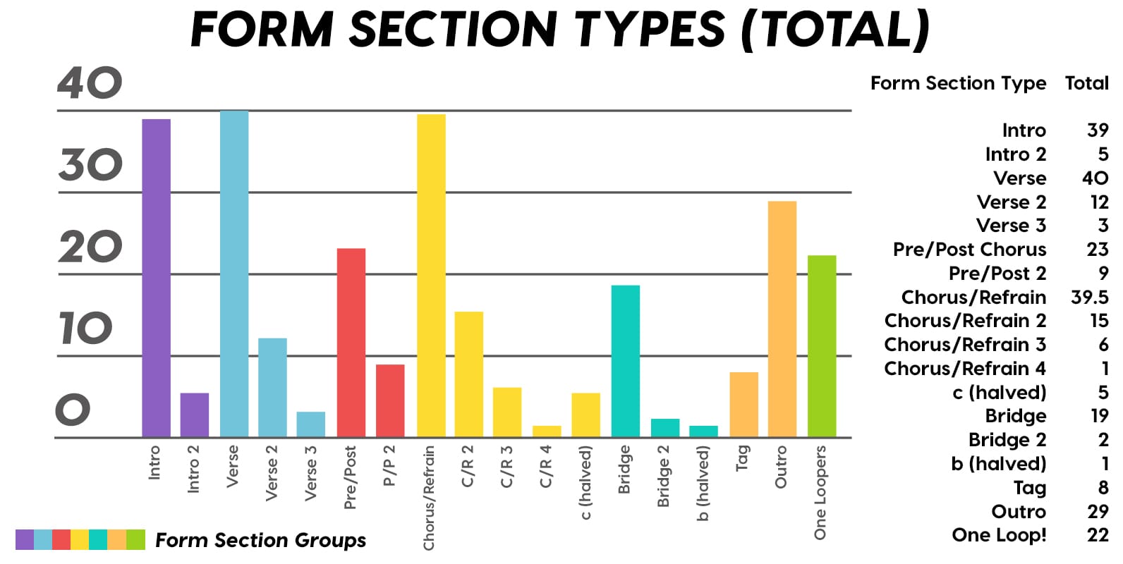 Guest post by Dean Olivet of Soundfly's Flypaper“My Mount Rushmore is me with four different expressions.” – Drake. Yes, Drake, yes it is.Welcome back, pop music scholars, and Look Alive… because we did it again.That’s right — we sent an even Better Now, out-of-this-WRLD probe past all the FEFE’s and ZEZE’s that were Meant to Be in the Top 5 of 2018’s Billboard Hot 100 charts, and what we got back was a tally of data and stats Grande enough to satiate all you Nonstop audiophiles’ consonance curiosity. Nice for What? Nice for showing any Childish Young Bunnyhow to craft a songXXXTensive enough to bang its way into a Top 40 slot, next year and beyond.Speaking of Top “40,” that’s literally what this year’s list totaled (all by itself this time!). Yep, there were 40 songs “Boo’d Up” in the Billboard’s Top 5 in 2018. Exactly 40 — how clean is that?Just like last year, our master song specs charts are up first, including: 2018’s trendiest tonalities, keys, tempos, meters, triads, song lengths, chord totals, form sections, and singer genders (compared, of course, to the number of times Drake himself shows up in this list). And below all these veritable knowledge bombs, you’ll be amazed to find individual stats and commentary for all 40 songs!“To B, or not to B.” That is… not a question this year, because none of our songs were in the key of B! It was E♭— minor, specifically — that was our huge winner this year (black keys on the piano in general, really), with low showings for the keys of D and E, once again proving that nobody writes Top 40 pop songs on their guitars anymore.Since we had some Lydian keys this year, and Lydian is technically a major mode, I lumped these songs in with the major column — above, at least. Below you can see these separated out.Very similar tonalities used this year, as compared to 2017. The major mode gained a little ground this year, chalking one more song, but it’s those sneaky-sultry minor modesthat are still dominating. Worth a shout are the upticks in Lydian and Phrygian, and it’s also interesting that harmonic minor scales doubled their representation from four songs to eight. Maybe the V chord is coming back in style after all?Similar to last year, songs lasting between 3:21-3:40 remain on top. The most improved category is the 2:41-3:00 song, increasing its presence sevenfold! And, as long as we’re talking songs and lengths of things, can we talk about Drake already? This is like the seventh paragraph and we still haven’t mentioned the length and breadth of Drake’s magnum double-album opus, Scorpion.The week his shipping container of beats and buddies dropped (Billboard week of July 14), His Eminent Drakiness had 22 — spell it out: twenty-two effing tracks — that made the Billboard Hot 100 that week. The lowest of which appeared at #57!What’s this have to do with song lengths? Mainly, this unheard-of achievement outlines, among other things, that song lengths, album lengths, and music video lengths just don’t matter as much anymore. Why?Because of streaming, because of fancy new Corolla dashboards that talk to you and stuff — that’s why. No, radio is not dead. Not yet, at least. But when you can listen to basically whatever you want, whenever you want, without going to the record store with a million bucks, you know that the days when songs-for-the-masses had to be on the shorter side and, I don’t know, be by different people — yeah, those days are gone.Looks like a pretty even tempo spread this year with 77-78 BPM eeking out a win. From 71-72 BPM there is still a gap in the chain, similar to last year, and from 113-118 BPM is still a very curious drought-land, at least when compared to all the tempos found in Rolling Stone’sGreatest 500 Songs of All Time list.I’m not sure if it’s interesting or anti-interesting that our meter chart matches almost exactly with last year’s, at thirty-seven 4/4s, two 12/8s, and instead of the uncommon gatling gun 24/16, we found a somewhat-rare-in-its-own-right 2/4 meter.3/4 time is still at large — anyone with information as to its whereabouts please contact: The Pianoman at 555-Lala-didada-dadum.Now let’s look at some anomalies for roman numeral chord types used. For instance, the iii and♭VII chord types appeared well above and below their average rates, respectively, and both the major and minor tonalities managed to borrow their opposite tonics, so that’s a fun spice you don’t often get to taste.Also, as our♭II chord types were technically diatonic (aka “regular”) to the Phrygian mode, our non-borrowed-or-secondary weirdo-chords this year were the viis (when it was once a ii/V/♭VI and once diatonic to Lydian) and also a I+ (augmented).Here we see that we’ve flattened out into a bit more of a bell curve rather than that middle-finger looking thing from 2017, with the four-chord song still being the norm. Panic! at the Disco threw some jazzy borrowed and secondary chords our way and pushed the collective envelope one column further than 2017, with an all-out eight-chorder.Pre- and post-choruses were a little less aggressive this year, even while variations on these chorus-abutting sections saw an increase. Interestingly, only “The Middle” dispensed with any intro material this year, and only Eminem’s “Killshot” got into the Top 5 without any chorus or refrain material, but I mean, he did say right at the start of the song that he wasn’t gonna repeat himself, so there you have it. (And yes, I said “chorus-abutting sections” back there, and yes, I had Morgan Freeman’s voice in my head when I said it … “chorus-abutting sections.“)Oh! And look up over there on the right. I’m very excited to share with you a new statistic I collected this year. Would you believe that 22 songs out of 40 were based off of just one single loop only (loop variations allowed)? That’s more than half. You may now com