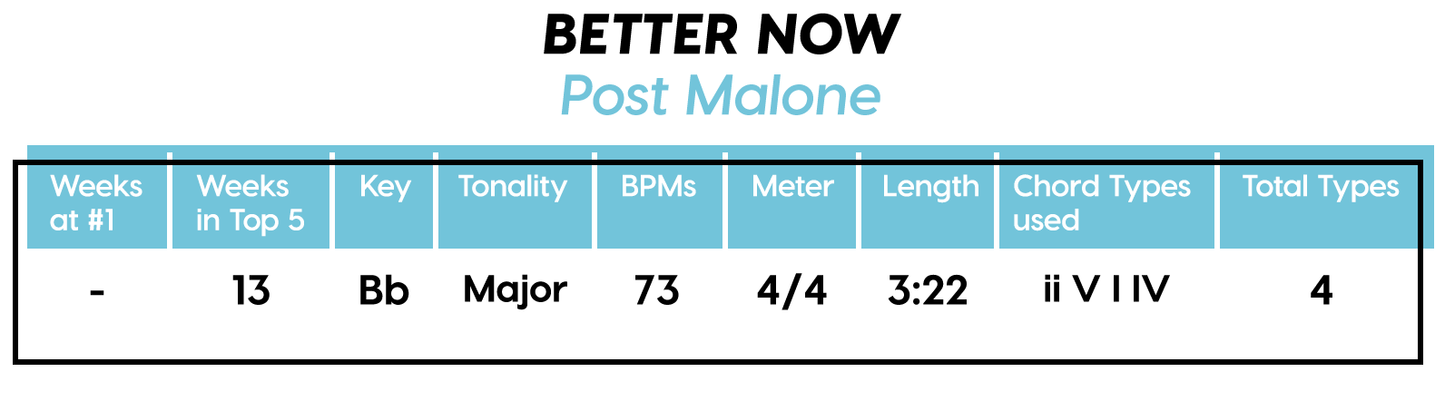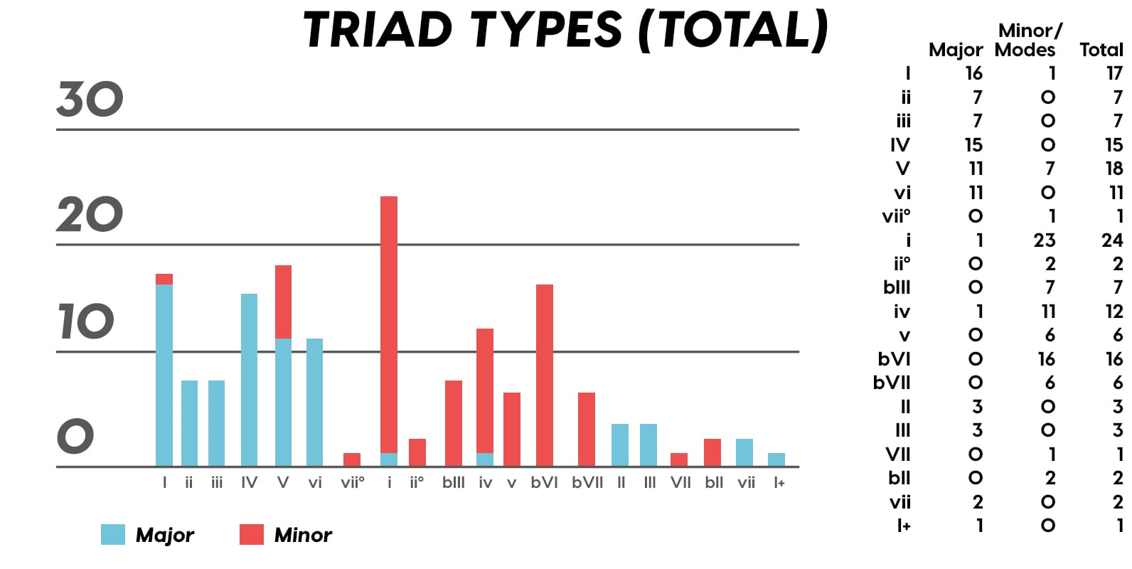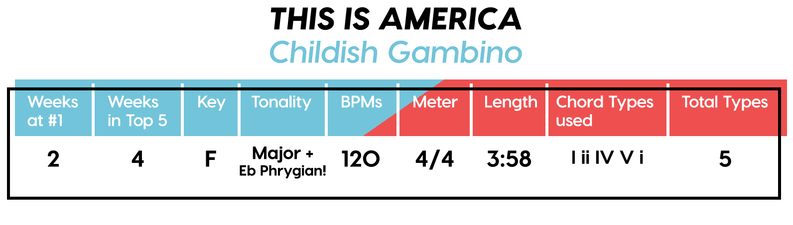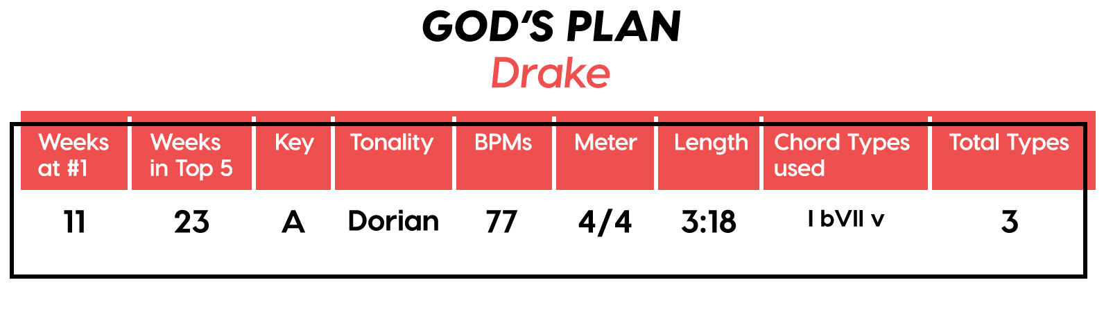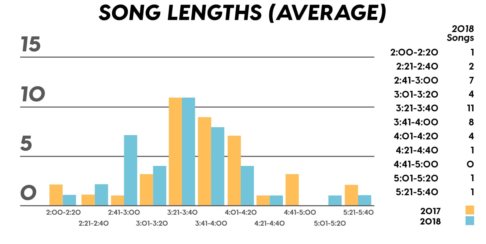 Guest post by Dean Olivet of Soundfly's Flypaper“My Mount Rushmore is me with four different expressions.” – Drake. Yes, Drake, yes it is.Welcome back, pop music scholars, and Look Alive… because we did it again.That’s right — we sent an even Better Now, out-of-this-WRLD probe past all the FEFE’s and ZEZE’s that were Meant to Be in the Top 5 of 2018’s Billboard Hot 100 charts, and what we got back was a tally of data and stats Grande enough to satiate all you Nonstop audiophiles’ consonance curiosity. Nice for What? Nice for showing any Childish Young Bunnyhow to craft a songXXXTensive enough to bang its way into a Top 40 slot, next year and beyond.Speaking of Top “40,” that’s literally what this year’s list totaled (all by itself this time!). Yep, there were 40 songs “Boo’d Up” in the Billboard’s Top 5 in 2018. Exactly 40 — how clean is that?Just like last year, our master song specs charts are up first, including: 2018’s trendiest tonalities, keys, tempos, meters, triads, song lengths, chord totals, form sections, and singer genders (compared, of course, to the number of times Drake himself shows up in this list). And below all these veritable knowledge bombs, you’ll be amazed to find individual stats and commentary for all 40 songs!“To B, or not to B.” That is… not a question this year, because none of our songs were in the key of B! It was E♭— minor, specifically — that was our huge winner this year (black keys on the piano in general, really), with low showings for the keys of D and E, once again proving that nobody writes Top 40 pop songs on their guitars anymore.Since we had some Lydian keys this year, and Lydian is technically a major mode, I lumped these songs in with the major column — above, at least. Below you can see these separated out.Very similar tonalities used this year, as compared to 2017. The major mode gained a little ground this year, chalking one more song, but it’s those sneaky-sultry minor modesthat are still dominating. Worth a shout are the upticks in Lydian and Phrygian, and it’s also interesting that harmonic minor scales doubled their representation from four songs to eight. Maybe the V chord is coming back in style after all?Similar to last year, songs lasting between 3:21-3:40 remain on top. The most improved category is the 2:41-3:00 song, increasing its presence sevenfold! And, as long as we’re talking songs and lengths of things, can we talk about Drake already? This is like the seventh paragraph and we still haven’t mentioned the length and breadth of Drake’s magnum double-album opus, Scorpion.The week his shipping container of beats and buddies dropped (Billboard week of July 14), His Eminent Drakiness had 22 — spell it out: twenty-two effing tracks — that made the Billboard Hot 100 that week. The lowest of which appeared at #57!What’s this have to do with song lengths? Mainly, this unheard-of achievement outlines, among other things, that song lengths, album lengths, and music video lengths just don’t matter as much anymore. Why?Because of streaming, because of fancy new Corolla dashboards that talk to you and stuff — that’s why. No, radio is not dead. Not yet, at least. But when you can listen to basically whatever you want, whenever you want, without going to the record store with a million bucks, you know that the days when songs-for-the-masses had to be on the shorter side and, I don’t know, be by different people — yeah, those days are gone.Looks like a pretty even tempo spread this year with 77-78 BPM eeking out a win. From 71-72 BPM there is still a gap in the chain, similar to last year, and from 113-118 BPM is still a very curious drought-land, at least when compared to all the tempos found in Rolling Stone’sGreatest 500 Songs of All Time list.I’m not sure if it’s interesting or anti-interesting that our meter chart matches almost exactly with last year’s, at thirty-seven 4/4s, two 12/8s, and instead of the uncommon gatling gun 24/16, we found a somewhat-rare-in-its-own-right 2/4 meter.3/4 time is still at large — anyone with information as to its whereabouts please contact: The Pianoman at 555-Lala-didada-dadum.Now let’s look at some anomalies for roman numeral chord types used. For instance, the iii and♭VII chord types appeared well above and below their average rates, respectively, and both the major and minor tonalities managed to borrow their opposite tonics, so that’s a fun spice you don’t often get to taste.Also, as our♭II chord types were technically diatonic (aka “regular”) to the Phrygian mode, our non-borrowed-or-secondary weirdo-chords this year were the viis (when it was once a ii/V/♭VI and once diatonic to Lydian) and also a I+ (augmented).Here we see that we’ve flattened out into a bit more of a bell curve rather than that middle-finger looking thing from 2017, with the four-chord song still being the norm. Panic! at the Disco threw some jazzy borrowed and secondary chords our way and pushed the collective envelope one column further than 2017, with an all-out eight-chorder.Pre- and post-choruses were a little less aggressive this year, even while variations on these chorus-abutting sections saw an increase. Interestingly, only “The Middle” dispensed with any intro material this year, and only Eminem’s “Killshot” got into the Top 5 without any chorus or refrain material, but I mean, he did say right at the start of the song that he wasn’t gonna repeat himself, so there you have it. (And yes, I said “chorus-abutting sections” back there, and yes, I had Morgan Freeman’s voice in my head when I said it … “chorus-abutting sections.“)Oh! And look up over there on the right. I’m very excited to share with you a new statistic I collected this year. Would you believe that 22 songs out of 40 were based off of just one single loop only (loop variations allowed)? That’s more than half. You may now com