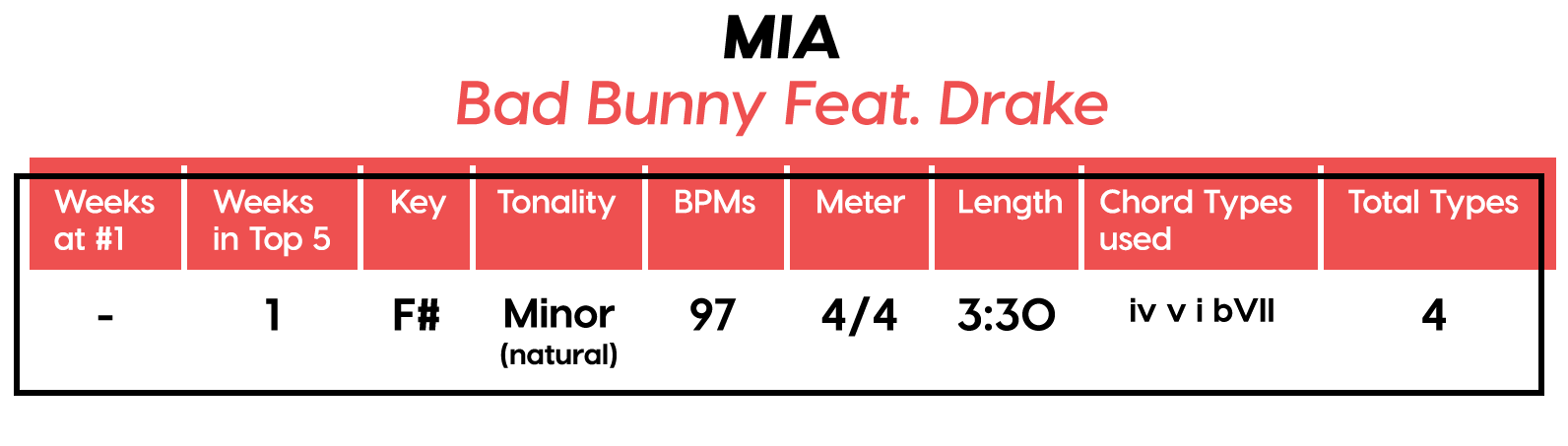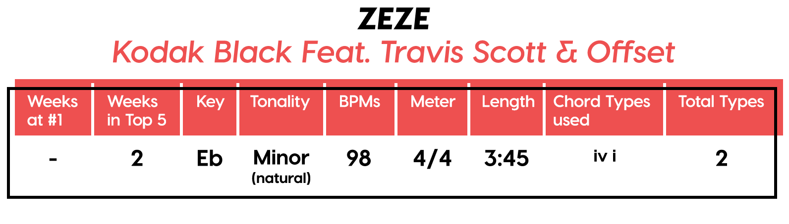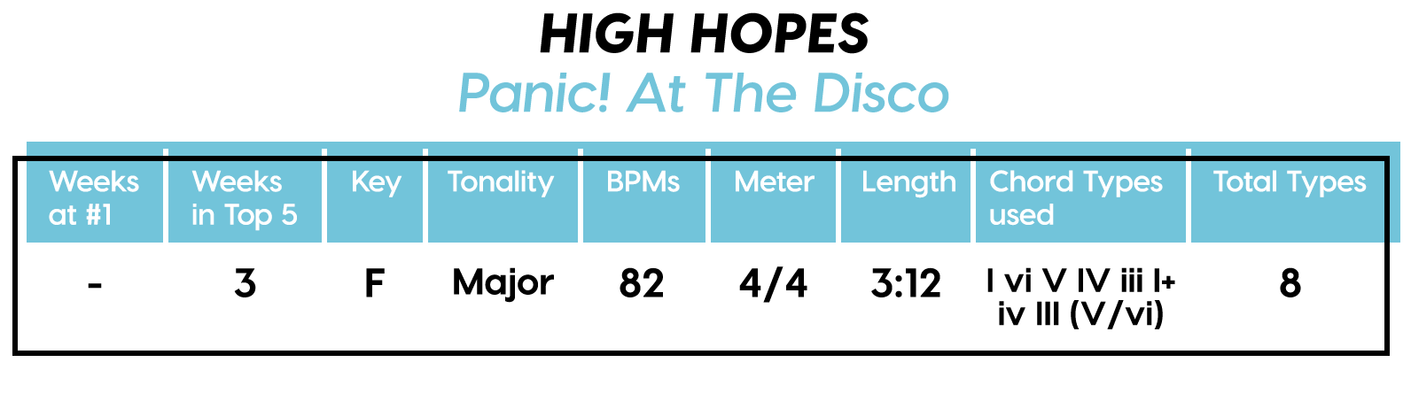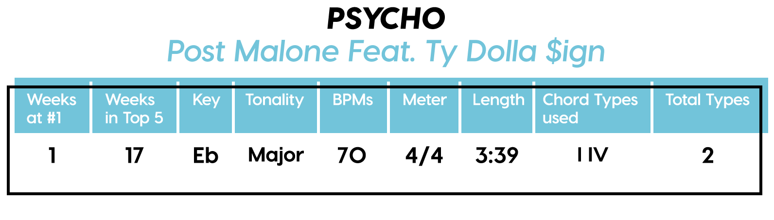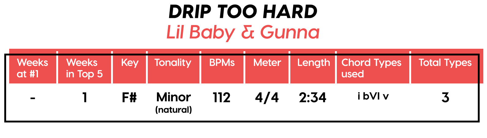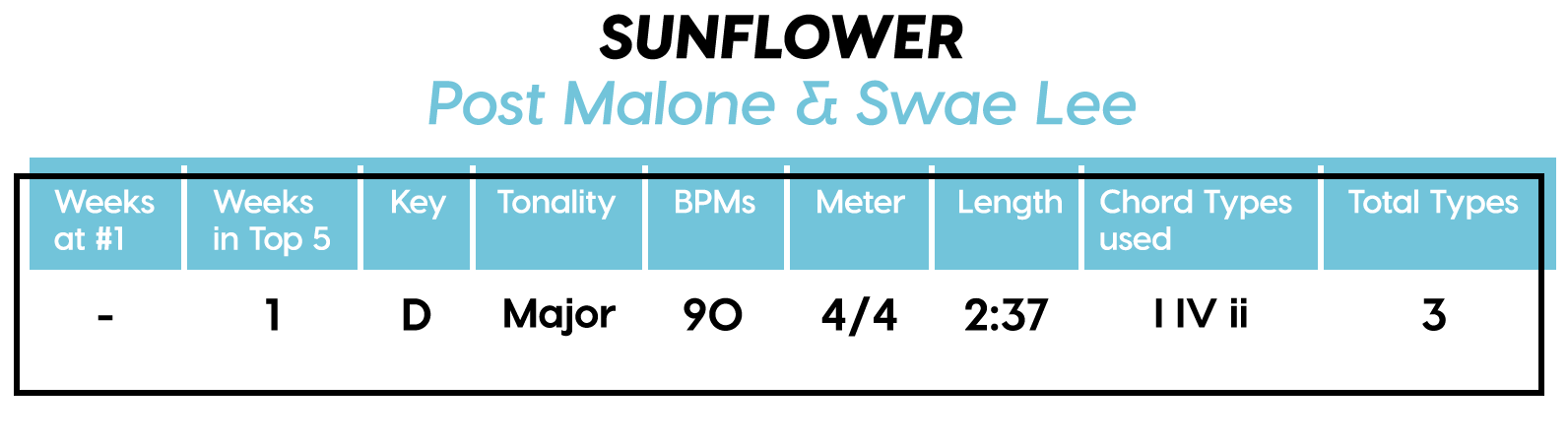 Guest post by Dean Olivet of Soundfly's Flypaper“My Mount Rushmore is me with four different expressions.” – Drake. Yes, Drake, yes it is.Welcome back, pop music scholars, and Look Alive… because we did it again.That’s right — we sent an even Better Now, out-of-this-WRLD probe past all the FEFE’s and ZEZE’s that were Meant to Be in the Top 5 of 2018’s Billboard Hot 100 charts, and what we got back was a tally of data and stats Grande enough to satiate all you Nonstop audiophiles’ consonance curiosity. Nice for What? Nice for showing any Childish Young Bunnyhow to craft a songXXXTensive enough to bang its way into a Top 40 slot, next year and beyond.Speaking of Top “40,” that’s literally what this year’s list totaled (all by itself this time!). Yep, there were 40 songs “Boo’d Up” in the Billboard’s Top 5 in 2018. Exactly 40 — how clean is that?Just like last year, our master song specs charts are up first, including: 2018’s trendiest tonalities, keys, tempos, meters, triads, song lengths, chord totals, form sections, and singer genders (compared, of course, to the number of times Drake himself shows up in this list). And below all these veritable knowledge bombs, you’ll be amazed to find individual stats and commentary for all 40 songs!“To B, or not to B.” That is… not a question this year, because none of our songs were in the key of B! It was E♭— minor, specifically — that was our huge winner this year (black keys on the piano in general, really), with low showings for the keys of D and E, once again proving that nobody writes Top 40 pop songs on their guitars anymore.Since we had some Lydian keys this year, and Lydian is technically a major mode, I lumped these songs in with the major column — above, at least. Below you can see these separated out.Very similar tonalities used this year, as compared to 2017. The major mode gained a little ground this year, chalking one more song, but it’s those sneaky-sultry minor modesthat are still dominating. Worth a shout are the upticks in Lydian and Phrygian, and it’s also interesting that harmonic minor scales doubled their representation from four songs to eight. Maybe the V chord is coming back in style after all?Similar to last year, songs lasting between 3:21-3:40 remain on top. The most improved category is the 2:41-3:00 song, increasing its presence sevenfold! And, as long as we’re talking songs and lengths of things, can we talk about Drake already? This is like the seventh paragraph and we still haven’t mentioned the length and breadth of Drake’s magnum double-album opus, Scorpion.The week his shipping container of beats and buddies dropped (Billboard week of July 14), His Eminent Drakiness had 22 — spell it out: twenty-two effing tracks — that made the Billboard Hot 100 that week. The lowest of which appeared at #57!What’s this have to do with song lengths? Mainly, this unheard-of achievement outlines, among other things, that song lengths, album lengths, and music video lengths just don’t matter as much anymore. Why?Because of streaming, because of fancy new Corolla dashboards that talk to you and stuff — that’s why. No, radio is not dead. Not yet, at least. But when you can listen to basically whatever you want, whenever you want, without going to the record store with a million bucks, you know that the days when songs-for-the-masses had to be on the shorter side and, I don’t know, be by different people — yeah, those days are gone.Looks like a pretty even tempo spread this year with 77-78 BPM eeking out a win. From 71-72 BPM there is still a gap in the chain, similar to last year, and from 113-118 BPM is still a very curious drought-land, at least when compared to all the tempos found in Rolling Stone’sGreatest 500 Songs of All Time list.I’m not sure if it’s interesting or anti-interesting that our meter chart matches almost exactly with last year’s, at thirty-seven 4/4s, two 12/8s, and instead of the uncommon gatling gun 24/16, we found a somewhat-rare-in-its-own-right 2/4 meter.3/4 time is still at large — anyone with information as to its whereabouts please contact: The Pianoman at 555-Lala-didada-dadum.Now let’s look at some anomalies for roman numeral chord types used. For instance, the iii and♭VII chord types appeared well above and below their average rates, respectively, and both the major and minor tonalities managed to borrow their opposite tonics, so that’s a fun spice you don’t often get to taste.Also, as our♭II chord types were technically diatonic (aka “regular”) to the Phrygian mode, our non-borrowed-or-secondary weirdo-chords this year were the viis (when it was once a ii/V/♭VI and once diatonic to Lydian) and also a I+ (augmented).Here we see that we’ve flattened out into a bit more of a bell curve rather than that middle-finger looking thing from 2017, with the four-chord song still being the norm. Panic! at the Disco threw some jazzy borrowed and secondary chords our way and pushed the collective envelope one column further than 2017, with an all-out eight-chorder.Pre- and post-choruses were a little less aggressive this year, even while variations on these chorus-abutting sections saw an increase. Interestingly, only “The Middle” dispensed with any intro material this year, and only Eminem’s “Killshot” got into the Top 5 without any chorus or refrain material, but I mean, he did say right at the start of the song that he wasn’t gonna repeat himself, so there you have it. (And yes, I said “chorus-abutting sections” back there, and yes, I had Morgan Freeman’s voice in my head when I said it … “chorus-abutting sections.“)Oh! And look up over there on the right. I’m very excited to share with you a new statistic I collected this year. Would you believe that 22 songs out of 40 were based off of just one single loop only (loop variations allowed)? That’s more than half. You may now com