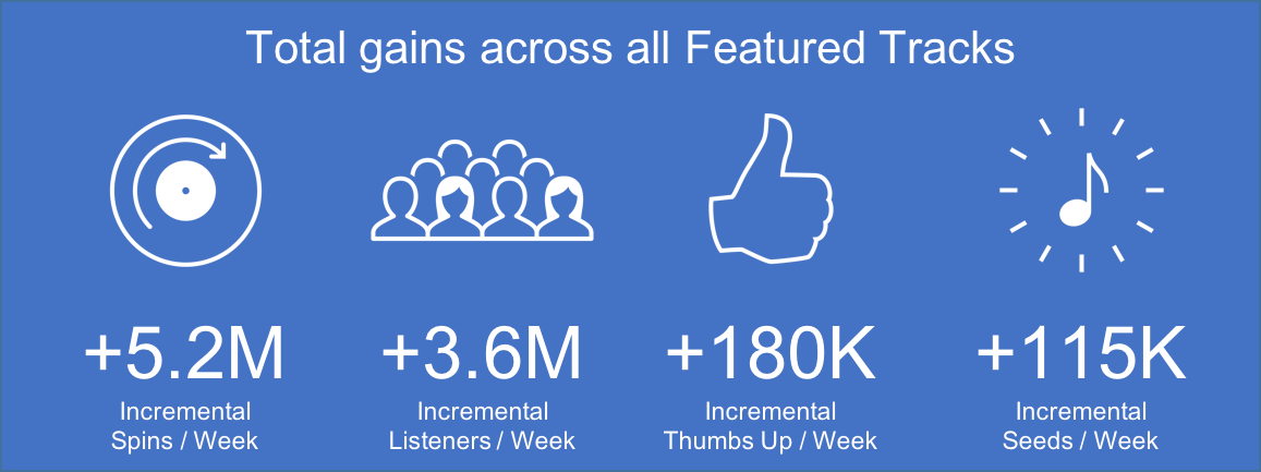 Impressions have value. If Pandora’s 1 billion audio message impressions carried the same cost as an average Facebook ad campaign, they would be worth about $40 million. (That number is based on the average click-through rate for Pandora’s audio messages and a cost of $1.68 per click for a highly targeted Facebook campaign.) This is effectively found money. For independent artists and artists on independent labels, who often have few resources for online marketing campaigns, audio messages provide an incredible return on investment.It’s safe to say Pandora’s Artist Marketing Platform is superior to its peers. Other streaming services also offer analytical insights that show an artist how and where people are listening to their music. Fortunately, these artist-focused products have practically become a basic requirement of doing business. But while the competition provides only a glimpse of their listeners, like a child looking at toys through a store window, Pandora has created a hands-on suite of artist tools. Artists can use the platform to communicate directly to their fans and promote their music, shows and new releases.On Tuesday, Pandora unveiled four improvements to the Artist Marketing Platform. Three are new features and one is an update to an existing feature. It’s not easy to get press coverage for product updates, features or milestones, but the breadth of Tuesday’s news coverage, from Forbes to Hits Daily Double to Variety, suggests a couple things. First, people are still taking note of Pandora’s investment in tools for the artist community. Second, the milestone of 1 billion message impressions is something of a head-turner.Two of the new features, Promote Show and Promote Single, increase the effectiveness of artists’ audio messages. Promote Show helps drive ticket sales by improving artists’ ability to geo-target fans across all the dates on a tour. Promote Single allows an artist to link a specific audio message to a Featured Track campaign. Another new feature is Custom Profile Photos, the most-requested feature since last fall.Featured Track has also been improved. Here’s how it works: an artist chooses a song — perhaps a new single — it wants listeners to hear. Featured Track will gently speed up the process by which listeners are recommended the track. This is fundamentally different than going through a gatekeeper — a radio DJ, a programmer — to reach listeners. Music discovery at Pandora is still a listener-driven phenomenon even with Featured Track’s assistance. If a listener thumbs (likes) a song, Pandora will spin it more often. What a listener hears is ultimately up to the listener. You can peak under Featured Tracks’ hood with this detailed post by a member of Pandora’s data science team or get a broad overview of the feature at the Artist Marketing Platform website.These new features have the added element of improved targeting. Pandora has tweaked the way it estimates a listener’s affinity for a particular artist. Put simply, additional signals have been taken into account to refine and improve the accuracy of both artist audio messages and featured tracks. Better accuracy results in messages heard by the most receptive listeners and tracks streamed to those listeners who are most likely to give the song a thumb. Artists want more thumbs because they will result in more spins and more seeds (a seed is an artist, album or track that’s used as the starting point — a seed — for a new station).A note to artists: Featured Tracks is a tool that’s too good to overlook. Its positive impact is even greater for artists who receive fewer than 1,000 spins a day, those up-and-coming, developing artists who have the most to benefit from access to powerful marketing tools.In early trials, Featured Tracks has posted great metrics. Take the thumb ratio as an example. Artists want listeners to thumb their songs because Pandora will adjust future recommendations accordingly and, most importantly, play the song again. When listeners hear a featured track, there’s an 82-percent chance they’ll give the song a thumb. That’s good targeting. Artists also want listeners to use them or their music to seed a new station. There’s been good performance here, too. Listeners of featured tracks are now creating 56 percent more seeds. A new seed is like a discovery engine. When a user creates a new seed based on a featured track, Pandora receives that signal and will spin that song and that artist more often. More thumbs and more seeds have given featured tracks an average growth in spins of 25 percent.Featured Tracks’ impact in stunning when viewed from space: 5.2 million incremental spins per week, or 1.8 billion incremental spins on an annual basis.