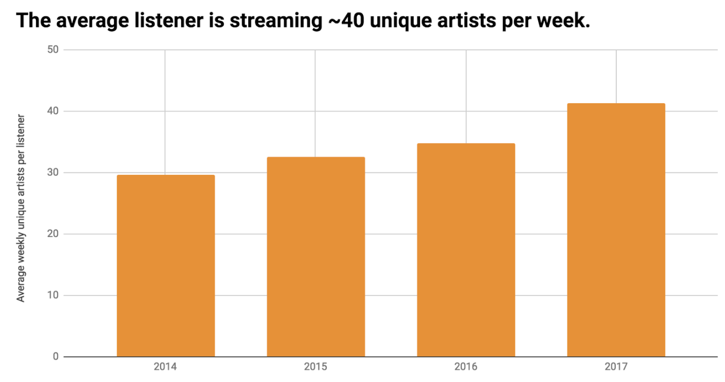 Right now, Spotify is seeing an explosion in listening diversity.The company defines that term as “the number of artists each listener streams per week.” Spotify attributes this to their robust selection of personalized and curatorial playlists. The variety of music discovery tools on Spotify have caused the average listener to go from listening to 30 artists per week in 2014 to over 40 in 2017. During this same time period, average weekly listening hours per user grew by 25%.This, of course, means that the more artists a listener tunes into, the more time they’ll spend on Spotify, which is good for the company — but it’s also good for musicians. Playlist makers have the ability to move listens from Top 40 artists to indie artists within this new culture of diverse listening, and on a grand scale, that can help spread the revenue generated per stream around more evenly than in the past.Spotify’s playlists and radio features are a huge part of this drive, but their Discover Weekly playlist and Daily Mixes have also helped spawn larger cultures around independent playlist makers as well. The company summarizes how their platform encourages growth like this:“Spotify’s ecosystem creates an environment where listeners are gently encouraged to discover new artists, find out when their favorite artists (or artists they might like) release new music, keep tabs on what’s hot in all kinds of genres, and rediscover forgotten gems, all of which contribute to listening diversity and more exposure for more artists.”I think what we can mainly take away from this blog post is that, firstly, music is not a zero-sum game. What is good for your contemporaries is good for you. It’s tempting to be competitive and try to steal plays away from other artists but, in the end, the more effort you put into generating plays, the more it helps other artists get discovered as well! Using this community aspect to your advantage is wise.Secondly (and this is perhaps a downside depending on your musical output), as listener diversity continues to grow, it’s more advantageous to release singles and short releases than full albums, via Spotify at least. Since people are listening to more artists in a given week, they have less and less time to focus on a single artist’s catalog. Plus, people are becoming more likely to hear about your music from a single song that’s featured on a playlist.+ Learn more on Soundfly: Discover unknown royalty and licensing-based revenue streams and how to collect them with Ari Herstand’s new, free course, How to Get All the Royalties You Never Knew Existed!