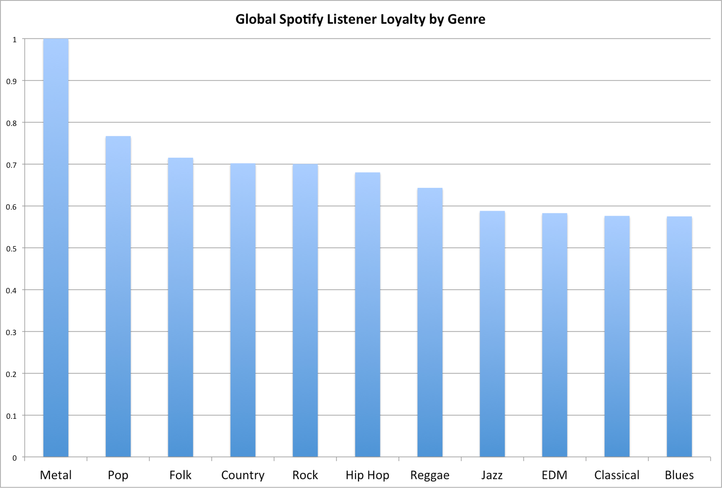 This blog post looks to measure which genres have the most loyal fans by seeing how many times fans return to listen to their favorite genres of music. First, Spotify identified each genres’ “core” artists. These are artists who are “staples” or most central to the genre. For example, Johnny Cash or Garth Brooks would be staples of country music, Bob Marley is a staple of reggae, and Iron Maiden and Ozzy Osbourne are staples of metal.According to author Eliot Van Buskirk:“To create a measure of genre loyalty, we divided the number of streams each core artist had by their number of listeners. All of the charts are normalized against the genre with the loyalest fans.”Globally, metal fans are the world’s loyalest by a pretty large margin.If you’re interested to see how genre loyalty plays out in a ton of different countries around the world, you should click on over to the article, but the biggest takeaway from all that country data is that locally homegrown genres inspire a lot of loyalty. Australian country fans are very loyal in Australia, Brazilian punk fans are the most loyal fans in Brazil, Italian indie pop (followed by Italian pop, Italian folk, and Italian jazz) fans are the most loyal in Italy, etc.That’s probably obvious, but there are two important takeaways from this.Firstly, you should probably pay attention to where you are when you’re making music, and it might be wise to borrow from some of the traditional songcraft styles, even if you don’t plan to release music in that genre. If you want listeners to come back time and time again, make sure you’re targeting the right listeners.Secondly, there is so much amazing music out there that people are very passionate about that we don’t necessarily get exposed to in the American mainstream. Check out some of these foreign genres and see what all the fuss is about!