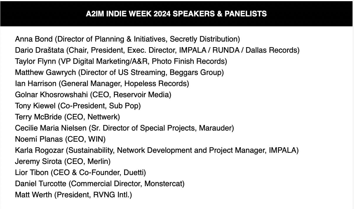 A2IM (The American Association of Independent Music) has announced the preliminary panels for its 2024 Indie Week to be held June 10 – 13 at the InterContinental New York’s Times Square.