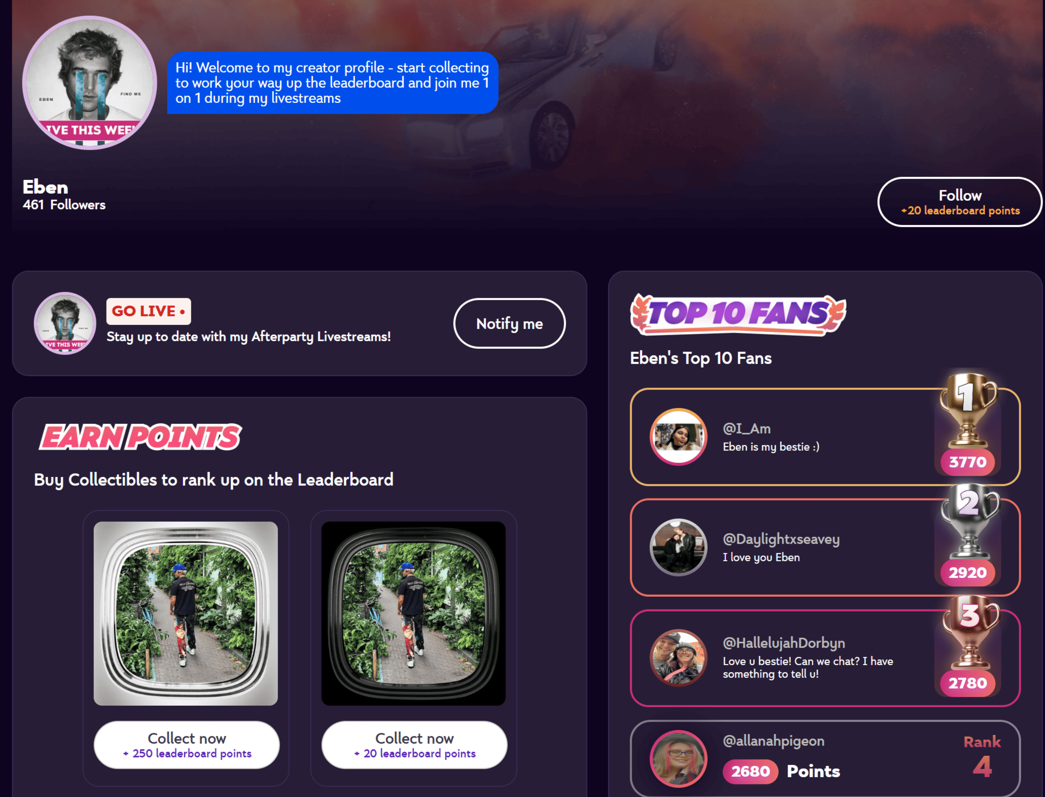 “Every interaction and piece of content fans share serves as a ‘point of access’ to exclusive experiences, opening up opportunities for fans to connect one-to-one with the creators on Afterparty Livestreams,” according to the startup.