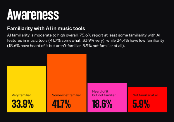 Musicians aged 25–54, many of them professionals and advanced players, are generally positive. Between 36% and 42% describe themselves as excited about AI in music tools, and frustration levels remain low.