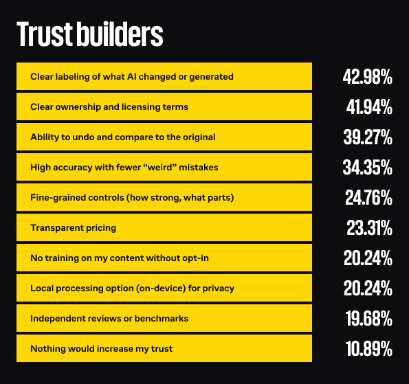 - 40–41% reject tools that copy an artist’s style without consent or train on others’ work without permission