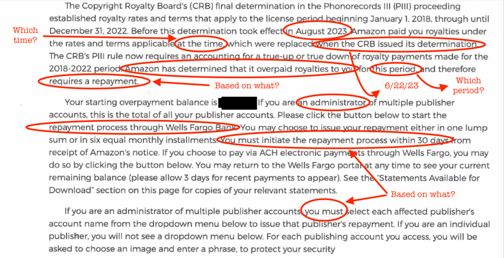 So if that’s true, and if Amazon paid PR II rates during the PR III appeal, why is there now an overpayment by Amazon? Wouldn’t you expect to see the true-up resulting in publishers receiving a credit for increasedrates? Especially if the stream counts and subscriber totals stayed the same on these previously-issued accounting statements? (Not to mention this may be happening at other services, too.)