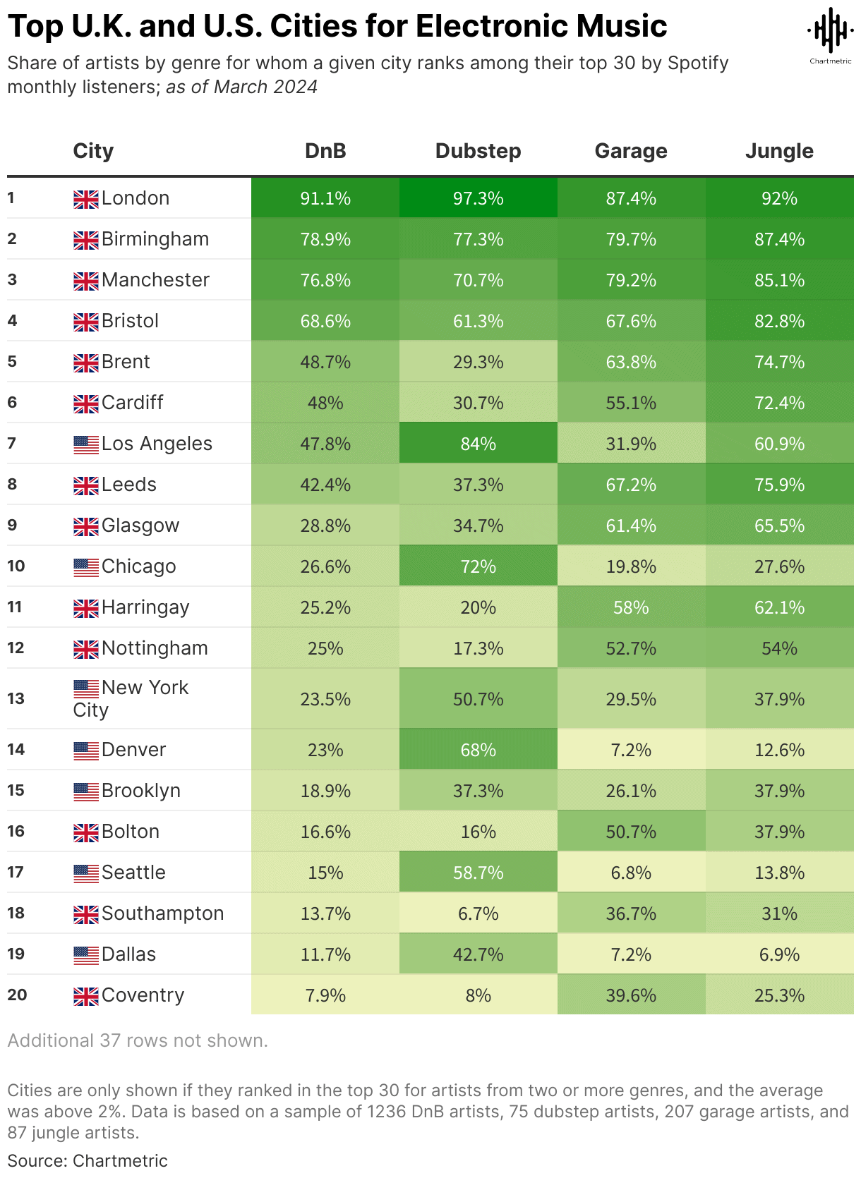Within each genre, when looking at the average country breakdown of each artist’s top 30 cities by Spotify monthly listeners, a clear pattern emerges. While cities in the U.S. take up twice as many slots as those in the U.K. in dubstep artists’ top 30 cities, the U.K. takes the lead for DnB, garage, and jungle artists. However, the smallest gap between the two countries is for DnB, indicating that the genre is similarly popular in both locations.