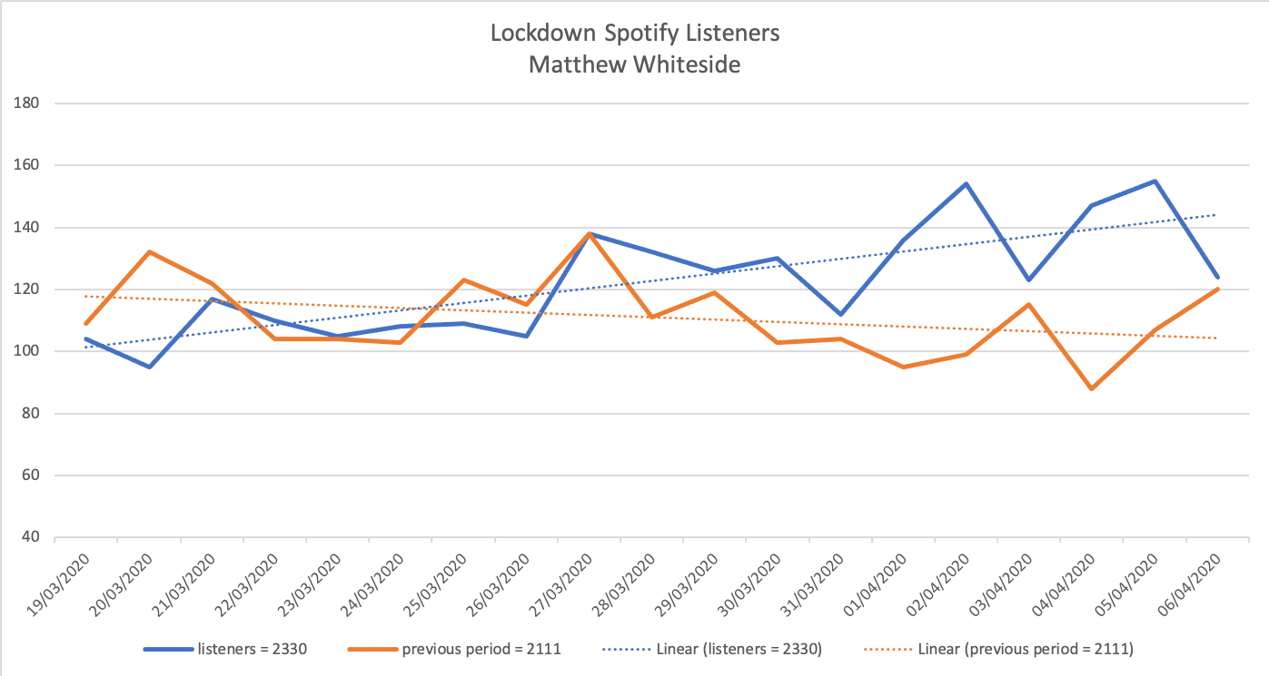 Looking at my graphs on Spotify for Artists I got the sense that my streams and listeners were increasing (my followers definitely were!) but the Artists platform doesn’t allow for any kind of analysis. So I downloaded the numbers and came up with these two graphs, confirming that my streams on Spotify are up!