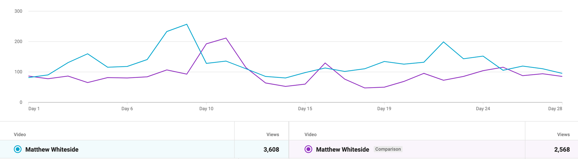 There is a similar trend on my YouTube channel score followers, with an increase of views from 2568 to 3608 which is about a 40% increase. The graph below is a screenshot from YouTube comparing the same period as Spotify.
