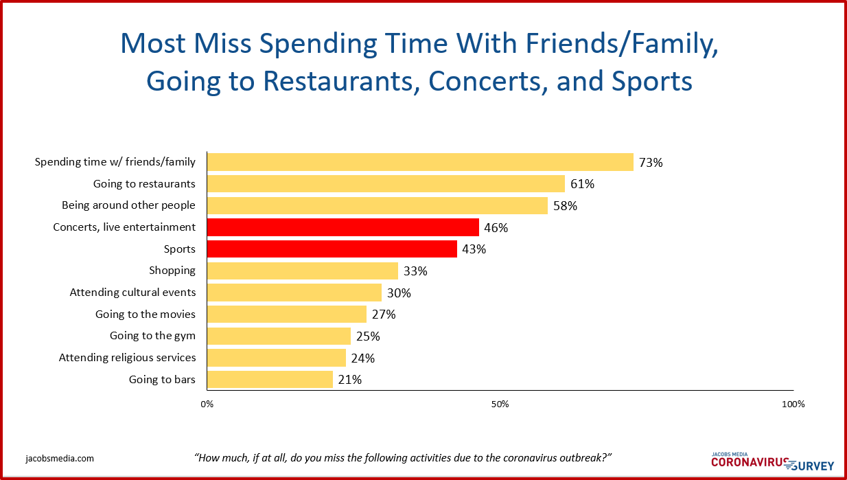 Yes, nearly 21,000 radio listeners told us they were jonesing on personal interaction with friends and family. But they were also missing entertainment activities – especially concerts and sporting events.