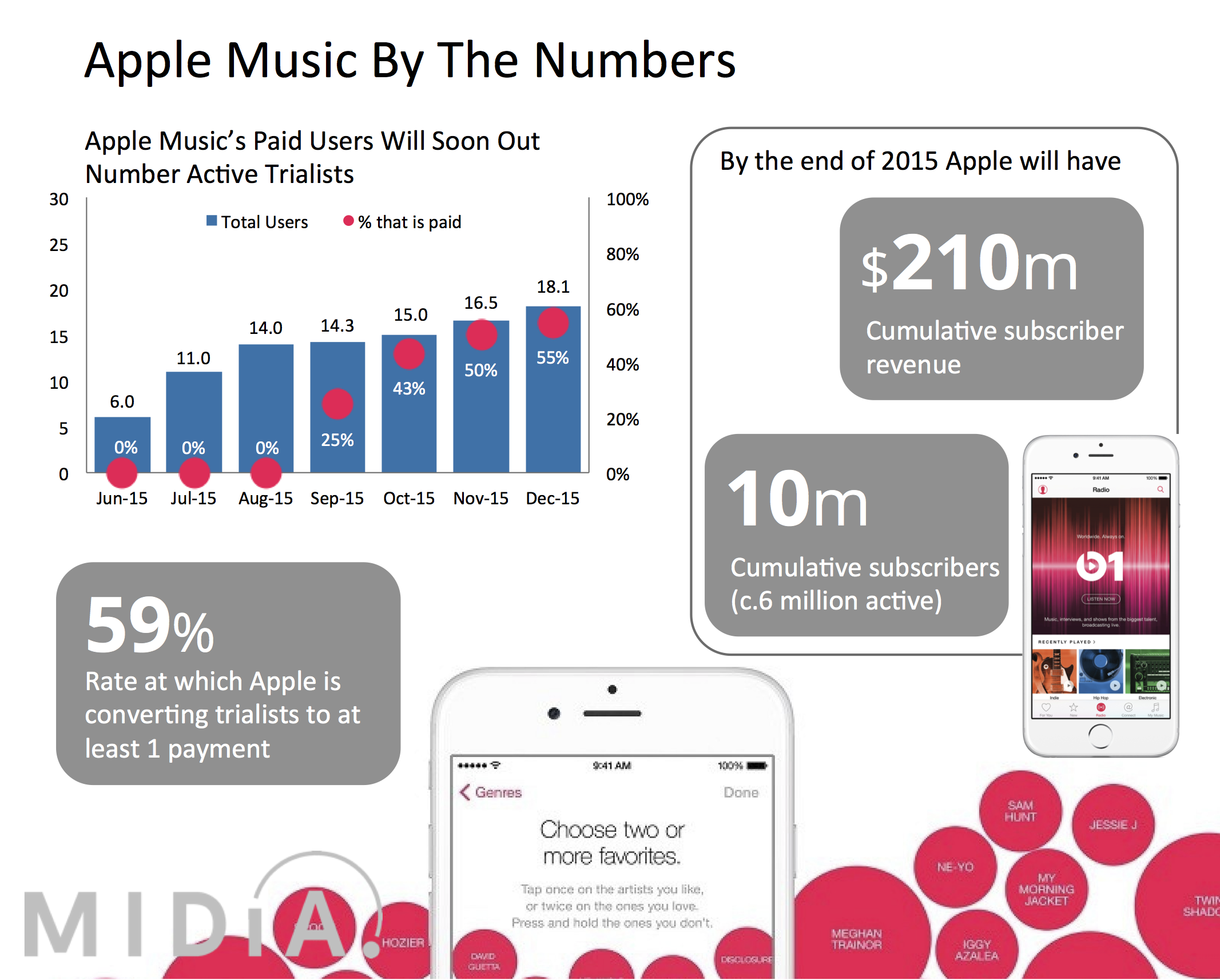 10 Million Cumulative Subscribers By Year EndIf Apple continues at the current rate it should get to around 10 million subscribers by year end, of which 6 million or so will be active (i.e. not churned). Which is again below my August prediction of 8.7 million because the acquisition funnel isn’t delivering as anticipated. In revenue terms that would deliver cumulative subscriber revenue of $220 million by the end of the year. Apple has earned around $140 million in total so far, of which $100 has gone to rights owners.And we shouldn’t understate the scale of Apple’s success so far, narrow funnel or not. It took Spotify 4 and a half years to get to 6.5 million subscribers. Granted, it was a very different world back then and much of that growth had come without the US and of course without the benefit of Apple’s integrated ecosystem. But even those considerations accounted for, Apple has gone from zero to hero in a flash. In August I stated ‘Apple is on track to be the number 2 streaming subscriptions provider after little more than 6 months in the game’ and that is exactly where they are now.To Restate Or Not To RestateMusic Business Worldwide cites an insider source that Spotify is on the verge of announcing its own new numbers. It will be interesting to see the fine print of how those numbers are reported. Spotify has seen an uptick in subscriber growth at the same time it introduced its $1 a month for 3 months promotion, which is effectively a paid extended trial. Here’s the conundrum. If those numbers are reported as subscribers then expect terrible churn (for subscriber numbers) but if they are reported as trialists then conversion rates will be great but total subscriber numbers will not. Common sense would dictate Spotify reporting those numbers as subscribers (they are paying after all) but that means at some stage Spotify is going to have to restate its numbers or provide some additional guidance. Which incidentally Apple will also eventually have to do if it reports it cumulative 10 million subscribers at year end / early 2016 rather than the active subscriber number of around 6 million.Apple and Spotify are now locked in a metrics arms race. Both will use every trick in their respective arsenals to make those numbers look as good as they possibly can. Whatever the outcome of that particular little spat, today’s numbers show us that even below its best, Apple just ran the first lap of a 5,000 metre race as if it was a 100 metre sprint. Let’s see if Apple can run an entire Mo Farah race at the speed of an Usain Bolt sprint.Related articles
