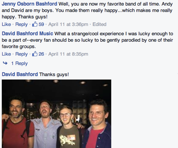 Two days ago we put up a video explaining how we found a cover video online for our song “Diane,” created by a fan named David Bashford. We realized it’d be pretty simple to recreate it shot-for-shot, and then we did just that. That we stalked David to capture his reaction to our video just puts us in some purgatory between Totally Cool Fan Oriented Band and Okay Guys That’s Like NSA Creepy, Stop It.