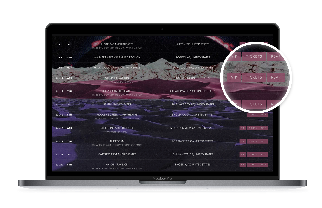 Any artist with a free Bandsintown For Artist account can contact fans who followed them on Bandsintown or RSVP’d to show using a widget on their own site, directly on Bandsintown.com, via a Smart Link, or through their partnerships with Spotify, Apple, Shazam, and more.
