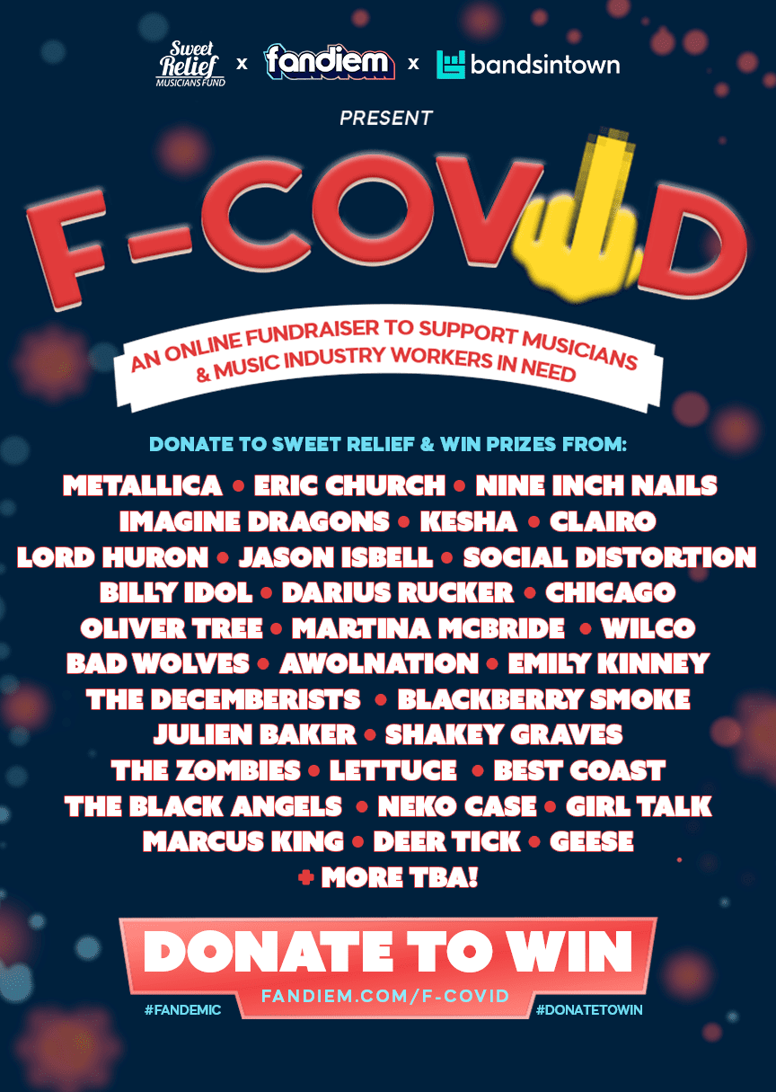 “We are thrilled to partner with Bandsintown to inspire artist and fan communities to support urgent causes,” states Fandiem’s Co-Founder Jared Heiman. “With the industry feeling the effects of another surge, the time is right to launch “F-Covid” and support Sweet Relief Musicians Fund. This campaign is our collective effort to help musicians and music industry workers whose livelihoods continue to be impacted.”