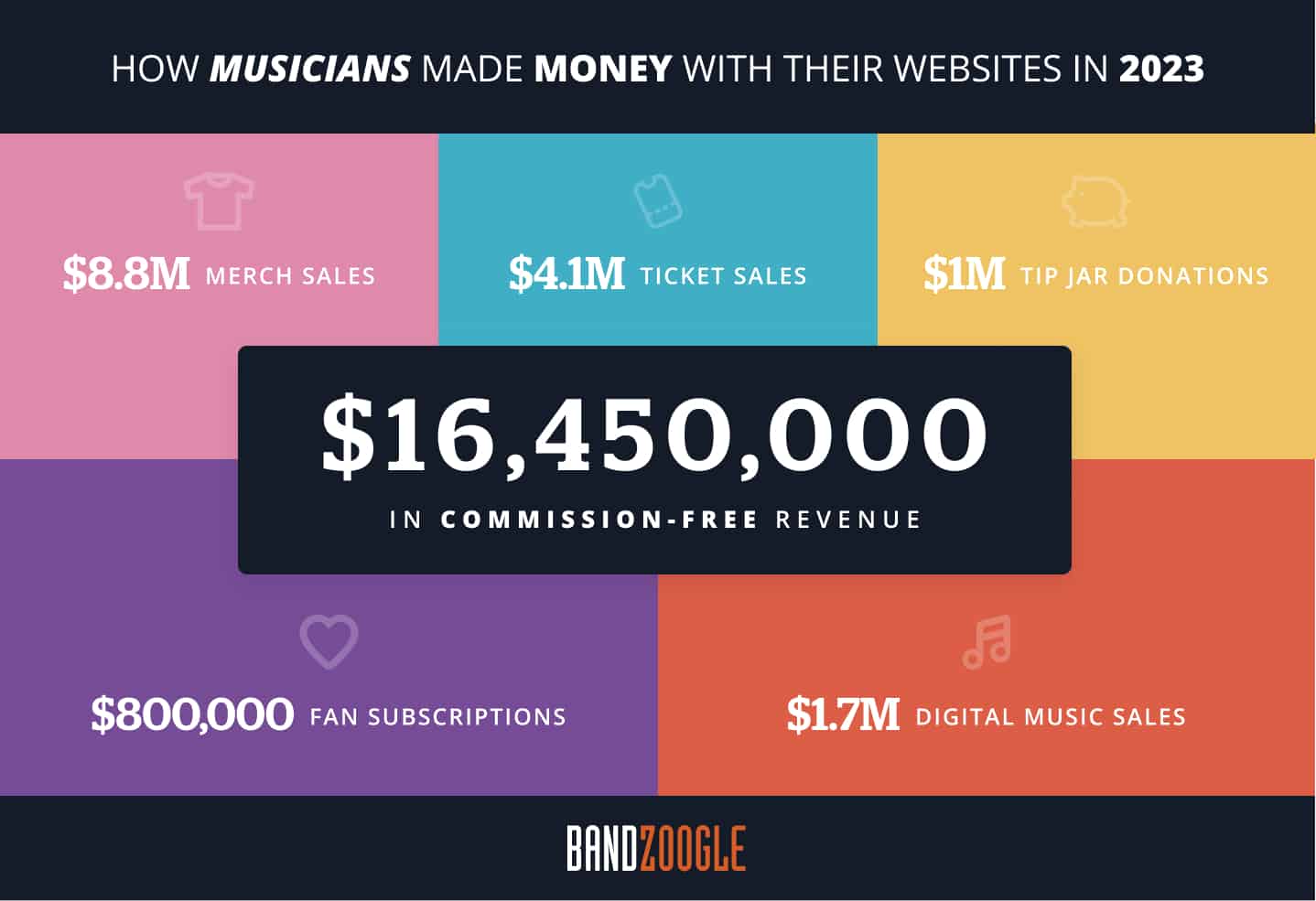 Musicians earned more than $16.4 million in commission-free revenue using Bandzooogle’s direct-to-fan sales tools, an increase of 21% over 2022.