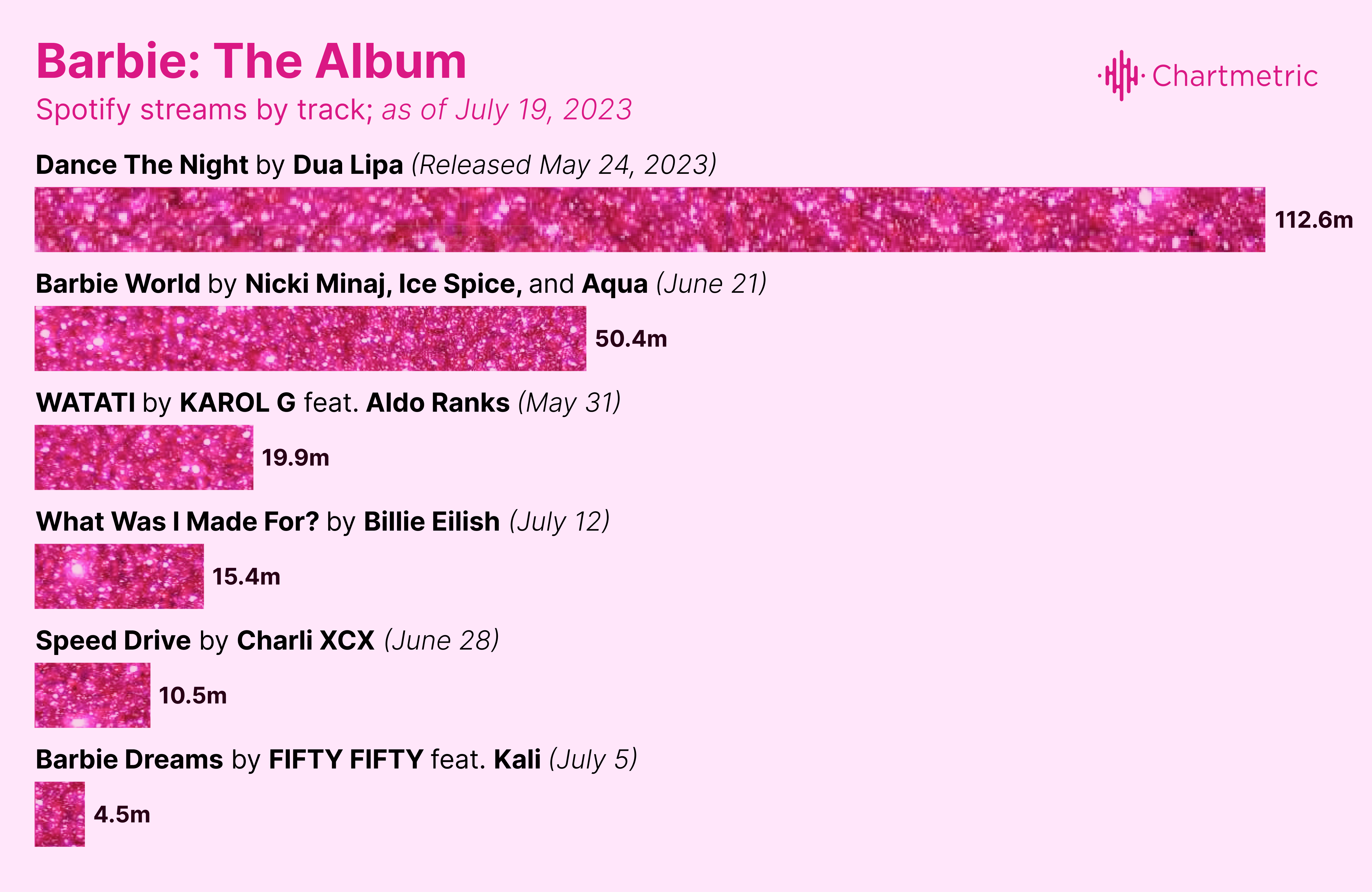 The song, which can be heard at the end of the movie’s main trailer along with a link to the album’s website, debuted at No. 7 on the Billboard Hot 100 with 16.2 million streams, 4.7 million in airplay, and 37,000 digital downloads. Aqua’s original “Barbie Girl” currently has a Chartmetric track score of 149 and has over 382 million streams on Spotify, gaining more than 47 million new streams in the past six months. Minaj, who has made Barbie an essential part of her aesthetic and brand, took the song seriously, sayingshe even rejected a few songs before deciding on going with “Barbie World.”
