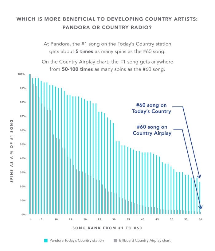 Guest post by Glenn Peoples, Music Insights and Analytics at Pandora Pandora has long said its Internet radio service is good for artists. Listeners can decide what they do and do not hear by “thumbing” songs. A listener won’t hear a song given a “thumb down.” A “thumb up” for positive feedback tells Pandora to play that song and more like it. Personalized Internet radio is democratic like that.Don’t get lost in the numbers. Just know that traditional country radio can be very powerful to a handful of stars while Pandora provides more opportunity for a larger number of country artists to get heard. In fact, the Pandora’s Today’s Country station [consistently one of the top stations at Pandora, by the way] can deliver to a developing or mid-tier artist up to 14x times the audience share they would have on the country airplay chart.There are numbers that back up this notion that Pandora is an audience engine for developing artists. Pandora is fair and beneficial simply because less popular artists have as much opportunity on Pandora as superstars. Broadcast country radio is far more slanted toward a handful of artists.