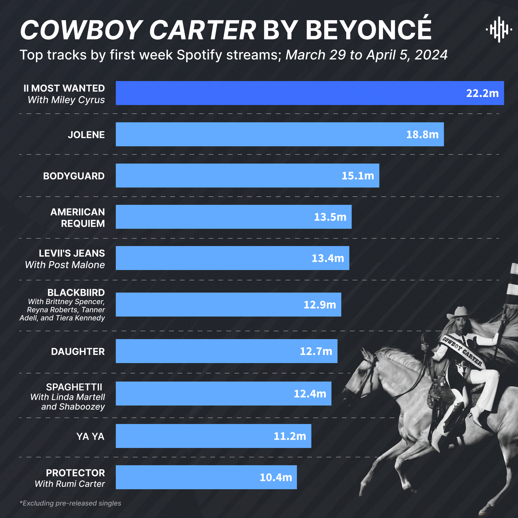 Beyoncé is back with COWBOY CARTER, taking her rightful place in country music as she continues to achieve multi-genre domination.