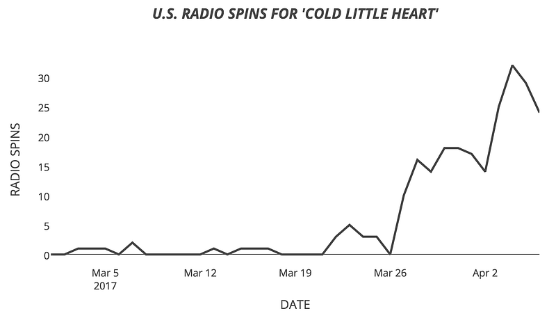 Guest post by Emily Blake of Next Big SoundSix or seven months ago, soul singer Michael Kiwanuka got an email from his manager about a request to use his song “Cold Little Heart” on a HBO miniseries called Big Little Lies, starring Reese Witherspoon, Nicole Kidman and Alexander Skarskård.“At the time, I assumed it was a small part in a scene,” Kiwanuka said last week. His manager, Robert Swerdlow of Starwood Management, added that it isn’t all that uncommon to get requests like this and for the song to not even make the final cut. Kiwanuka didn’t think it would be all that different from other requests he’d received for songs off his 2016 album Love & Hate. (Both “Black Man in a White World” and “Rule the World” were featured in scenes in Netflix’s Baz Luhrmann-directed The Get Down, for example.)But right around February 19, when Big Little Lies premiered, things started “going crazy” on Kiwanuka’s social media feeds. And that’s when he realized that “Cold Little Heart’ provided the musical pulse to the opening credits — with a minute and a half of the song featured.By the time the miniseries’ finale on April 2 — which pulled in right around 1.9 million viewers, according to Nielsen — things got even crazier. According to analytics provider Next Big Sound, in the year leading up to the mini-series’ premiere, Kiwanuka had been averaging right around 50 artist station adds on Pandora per day. In the past seven days, that average has been over 550 per day— placing him on the list of Pandora Trendsetters. According to Billboard, “Cold Little Heart” was on Shazam’s United States Top 100 chart every week during the miniseries’ seven-week run. He’s also added more than 7,700 fans on Facebook and racked up over 43,000 Wikipedia page views since the show premiered.In the past week, Michael Kiwanuka has averaged over 550 daily artist station adds on Pandora.While Swerdlow, Kiwanuka’s manager, has had several artists featured on television shows, never seen anything this big before, calling it a “bit of a eureka moment.”“It’s become a little bit of a fine art in the past couple years. I think it goes back to 90210 and The O.C. Those were the real game-changers where there was a real creative force and art form, fitting sound and vision together,” he said. “When they get it right and it strikes a chord. That’s the kind of magic moment…. this is definitely one of those moments where everything just comes together beautifully.”Kiwanuka, too, has alway been intrigued by the marriage of music and film.“When I’m writing music, I always imagine what it would be like if you could set a picture to it… My relationship to hearing some of my favorite songs so many times were tied to a movie,” he said, pointing to the opening scene of Quentin Tarantino’s Jackie Brown — featuring Bobby Womack’s “Across 110th Street” — as one of his first inspirations. But his attraction to TV is not just an artistic one, but marketing too. Kiwanuka says television “opens the door for people like myself, artists who don’t fit a certain mold.”Specifically, the pop radio mold. Last summer, when Love & Hate was first released, Kiwanuka wanted to push singles to alternative radio stations in the U.S., but “it didn’t happen.” One reason is because most of the songs on Love & Hate run relatively long — with the original version of “Cold Little Heart” clocking in at 9 minutes, 57 seconds.And even if radio stations weren’t playing “Cold Little Heart” last year, the buzz around Big Little Lies seems to have changed that. In the United States, the song has seen a month-on-month increase in radio spins of nearly 5,000%.In the United States, “Cold Little Heart” has seen a month-on-month increase in radio spins of nearly 5,000%.Not only has Big Little Lies expanded Kiwanuka’s reach, but he’s also seen increased engagement as well, which he ties to the manner in which people consume television. Unlike radio, it isn’t just “on in the background,” he said.“With TV becoming more like cinema, they’re looking at music like the way Tarantino would, devoting a long portion of a song to a long, slow scene, so they put it on their shows that people tune into and they get to hear your music but they actually have to sit and listen to it,” he said. “The world’s so fast paced but when you’re watching something, people are forced to listen to it. And if they don’t like it they don’t like it, but at least they listen to it.”Thanks to Karl Sluis.