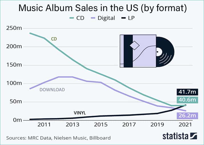 Here we see that the CD unit sales, in green, did indeed go up industry-wide in 2021 after a pretty long slide over the past decade. It’s actually more than a decade, but the chart gives us data from 2011 to 2021. We also see that vinyl, in black, has grown significantly — from almost nothing a decade ago — and that downloads (purple) are continuing to decline.